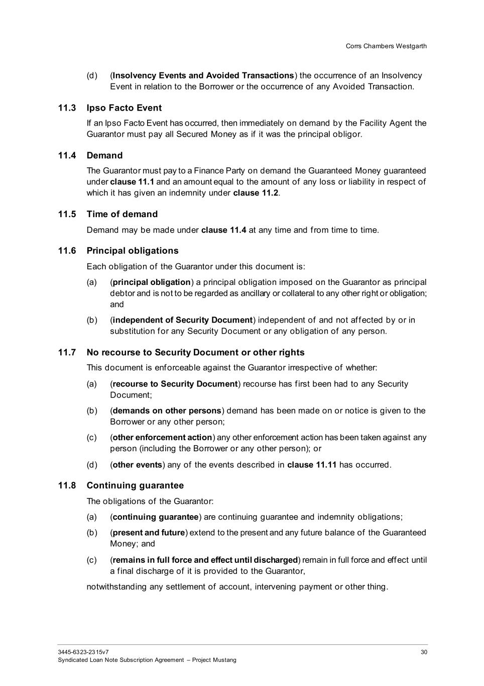 Corrs Chambers Westgarth 3445-6323-2315v7 30 Syndicated Loan Note Subscription Agreement – Project Mustang (d) (Insolvency Events and Avoided Transactions) the occurrence of an Insolvency Event in relation to the Borrower or the occurrence of any Avoided Transaction. 11.3 Ipso Facto Event If an Ipso Facto Event has occurred, then immediately on demand by the Facility Agent the Guarantor must pay all Secured Money as if it was the principal obligor. 11.4 Demand The Guarantor must pay to a Finance Party on demand the Guaranteed Money guaranteed under clause 11.1 and an amount equal to the amount of any loss or liability in respect of which it has given an indemnity under clause 11.2. 11.5 Time of demand Demand may be made under clause 11.4 at any time and f rom time to time. 11.6 Principal obligations Each obligation of the Guarantor under this document is: (a) (principal obligation) a principal obligation imposed on the Guarantor as principal debtor and is not to be regarded as ancillary or collateral to any other right or obligation; and (b) (independent of Security Document) independent of and not af fected by or in substitution for any Security Document or any obligation of any person. 11.7 No recourse to Security Document or other rights This document is enforceable against the Guarantor irrespective of whether: (a) (recourse to Security Document) recourse has f irst been had to any Security Document; (b) (demands on other persons) demand has been made on or notice is given to the Borrower or any other person; (c) (other enforcement action) any other enforcement action has been taken against any person (including the Borrower or any other person); or (d) (other events) any of the events described in clause 11.11 has occurred. 11.8 Continuing guarantee The obligations of the Guarantor: (a) (continuing guarantee) are continuing guarantee and indemnity obligations; (b) (present and future) extend to the present and any future balance of the Guaranteed Money; and (c) (remains in full force and effect until discharged) remain in full force and effect until a f inal discharge of it is provided to the Guarantor, notwithstanding any settlement of account, intervening payment or other thing.