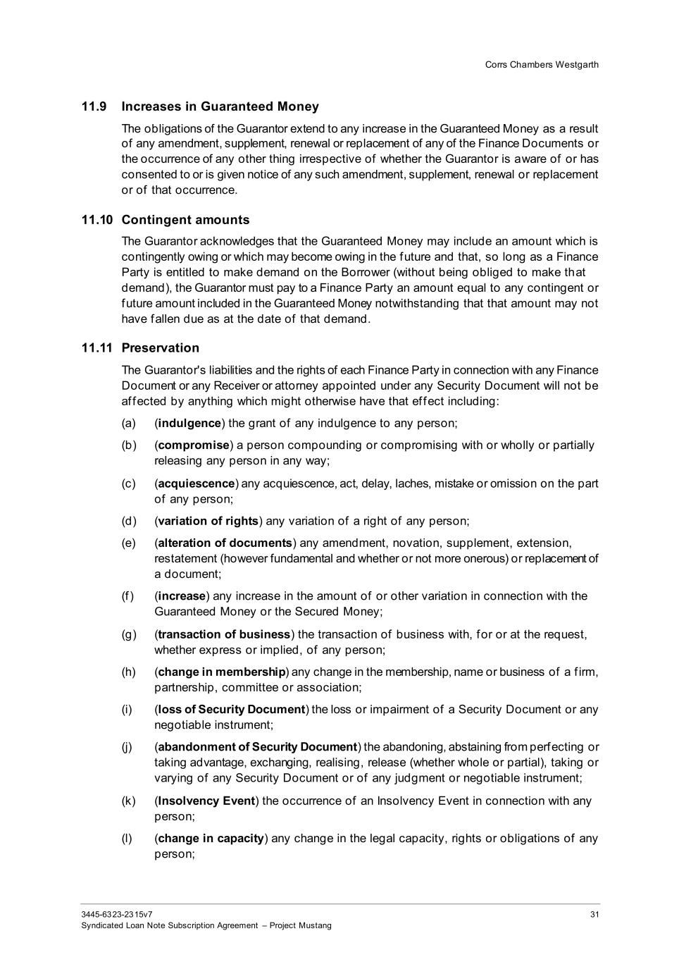 Corrs Chambers Westgarth 3445-6323-2315v7 31 Syndicated Loan Note Subscription Agreement – Project Mustang 11.9 Increases in Guaranteed Money The obligations of the Guarantor extend to any increase in the Guaranteed Money as a result of any amendment, supplement, renewal or replacement of any of the Finance Documents or the occurrence of any other thing irrespective of whether the Guarantor is aware of or has consented to or is given notice of any such amendment, supplement, renewal or replacement or of that occurrence. 11.10 Contingent amounts The Guarantor acknowledges that the Guaranteed Money may include an amount which is contingently owing or which may become owing in the future and that, so long as a Finance Party is entitled to make demand on the Borrower (without being obliged to make that demand), the Guarantor must pay to a Finance Party an amount equal to any contingent or future amount included in the Guaranteed Money notwithstanding that that amount may not have fallen due as at the date of that demand. 11.11 Preservation The Guarantor's liabilities and the rights of each Finance Party in connection with any Finance Document or any Receiver or attorney appointed under any Security Document will not be af fected by anything which might otherwise have that ef fect including: (a) (indulgence) the grant of any indulgence to any person; (b) (compromise) a person compounding or compromising with or wholly or partially releasing any person in any way; (c) (acquiescence) any acquiescence, act, delay, laches, mistake or omission on the part of any person; (d) (variation of rights) any variation of a right of any person; (e) (alteration of documents) any amendment, novation, supplement, extension, restatement (however fundamental and whether or not more onerous) or replacement of a document; (f ) (increase) any increase in the amount of or other variation in connection with the Guaranteed Money or the Secured Money; (g) (transaction of business) the transaction of business with, for or at the request, whether express or implied, of any person; (h) (change in membership) any change in the membership, name or business of a f irm, partnership, committee or association; (i) (loss of Security Document) the loss or impairment of a Security Document or any negotiable instrument; (j) (abandonment of Security Document) the abandoning, abstaining from perfecting or taking advantage, exchanging, realising, release (whether whole or partial), taking or varying of any Security Document or of any judgment or negotiable instrument; (k) (Insolvency Event) the occurrence of an Insolvency Event in connection with any person; (l) (change in capacity) any change in the legal capacity, rights or obligations of any person;