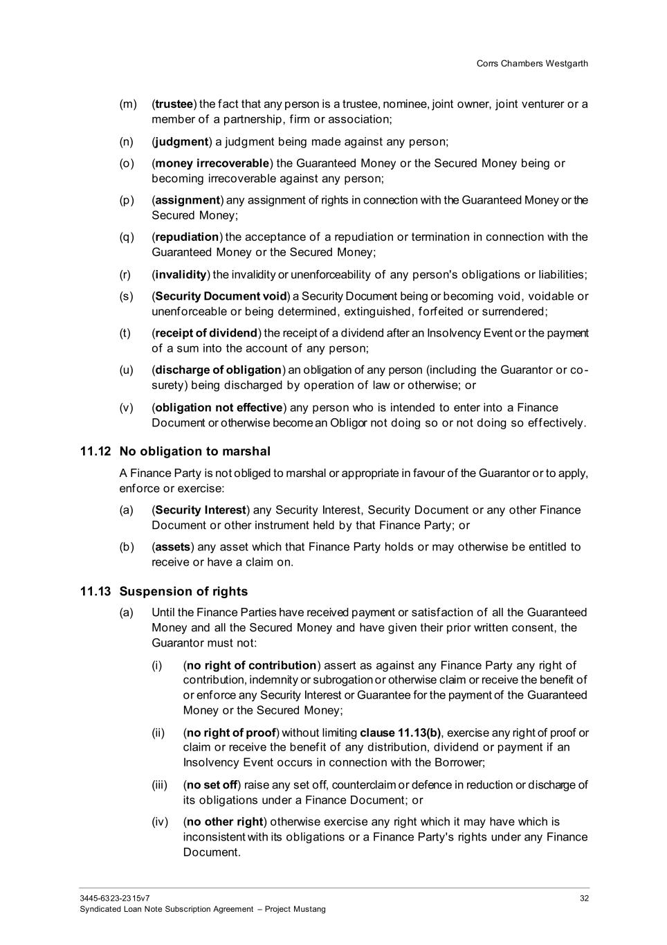 Corrs Chambers Westgarth 3445-6323-2315v7 32 Syndicated Loan Note Subscription Agreement – Project Mustang (m) (trustee) the fact that any person is a trustee, nominee, joint owner, joint venturer or a member of a partnership, f irm or association; (n) (judgment) a judgment being made against any person; (o) (money irrecoverable) the Guaranteed Money or the Secured Money being or becoming irrecoverable against any person; (p) (assignment) any assignment of rights in connection with the Guaranteed Money or the Secured Money; (q) (repudiation) the acceptance of a repudiation or termination in connection with the Guaranteed Money or the Secured Money; (r) (invalidity) the invalidity or unenforceability of any person's obligations or liabilities; (s) (Security Document void) a Security Document being or becoming void, voidable or unenforceable or being determined, extinguished, forfeited or surrendered; (t) (receipt of dividend) the receipt of a dividend after an Insolvency Event or the payment of a sum into the account of any person; (u) (discharge of obligation) an obligation of any person (including the Guarantor or co - surety) being discharged by operation of law or otherwise; or (v) (obligation not effective) any person who is intended to enter into a Finance Document or otherwise become an Obligor not doing so or not doing so ef fectively. 11.12 No obligation to marshal A Finance Party is not obliged to marshal or appropriate in favour of the Guarantor or to apply, enforce or exercise: (a) (Security Interest) any Security Interest, Security Document or any other Finance Document or other instrument held by that Finance Party; or (b) (assets) any asset which that Finance Party holds or may otherwise be entitled to receive or have a claim on. 11.13 Suspension of rights (a) Until the Finance Parties have received payment or satisfaction of all the Guaranteed Money and all the Secured Money and have given their prior written consent, the Guarantor must not: (i) (no right of contribution) assert as against any Finance Party any right of contribution, indemnity or subrogation or otherwise claim or receive the benefit of or enforce any Security Interest or Guarantee for the payment of the Guaranteed Money or the Secured Money; (ii) (no right of proof) without limiting clause 11.13(b), exercise any right of proof or claim or receive the benef it of any distribution, dividend or payment if an Insolvency Event occurs in connection with the Borrower; (iii) (no set off) raise any set off, counterclaim or defence in reduction or discharge of its obligations under a Finance Document; or (iv) (no other right) otherwise exercise any right which it may have which is inconsistent with its obligations or a Finance Party's rights under any Finance Document.