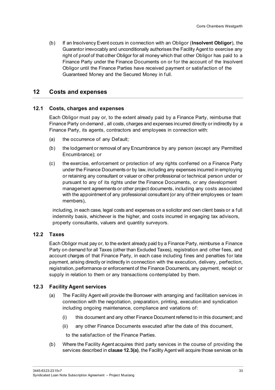 Corrs Chambers Westgarth 3445-6323-2315v7 33 Syndicated Loan Note Subscription Agreement – Project Mustang (b) If an Insolvency Event occurs in connection with an Obligor (Insolvent Obligor), the Guarantor irrevocably and unconditionally authorises the Facility Agent to exercise any right of proof of that other Obligor for all money which that other Obligor has paid to a Finance Party under the Finance Documents on or for the account of the Insolvent Obligor until the Finance Parties have received payment or satisfaction of the Guaranteed Money and the Secured Money in full. 12 Costs and expenses 12.1 Costs, charges and expenses Each Obligor must pay or, to the extent already paid by a Finance Party, reimburse that Finance Party on demand , all costs, charges and expenses incurred directly or indirectly by a Finance Party, its agents, contractors and employees in connection with: (a) the occurrence of any Default; (b) the lodgement or removal of any Encumbrance by any person (except any Permitted Encumbrance); or (c) the exercise, enforcement or protection of any rights conferred on a Finance Party under the Finance Documents or by law, including any expenses incurred in employing or retaining any consultant or valuer or other professional or technical person under or pursuant to any of its rights under the Finance Documents, or any development management agreements or other project documents, including any costs associated with the appointment of any professional consultant (or any of their employees or team members), including, in each case, legal costs and expenses on a solicitor and own client basis or a full indemnity basis, whichever is the higher, and costs incurred in engaging tax advisors, property consultants, valuers and quantity surveyors. 12.2 Taxes Each Obligor must pay or, to the extent already paid by a Finance Party, reimburse a Finance Party on demand for all Taxes (other than Excluded Taxes), registration and other fees, and account charges of that Finance Party, in each case including f ines and penalties for late payment, arising directly or indirectly in connection with the execution, delivery , perfection, registration, performance or enforcement of the Finance Documents, any payment, receipt or supply in relation to them or any transactions contemplated by them. 12.3 Facility Agent services (a) The Facility Agent will provide the Borrower with arranging and facilitation services in connection with the negotiation, preparation, printing, execution and syndication including ongoing maintenance, compliance and variations of : (i) this document and any other Finance Document referred to in this document; and (ii) any other Finance Documents executed af ter the date of this document, to the satisfaction of the Finance Parties. (b) Where the Facility Agent acquires third party services in the course of providing the services described in clause 12.3(a), the Facility Agent will acquire those services on its