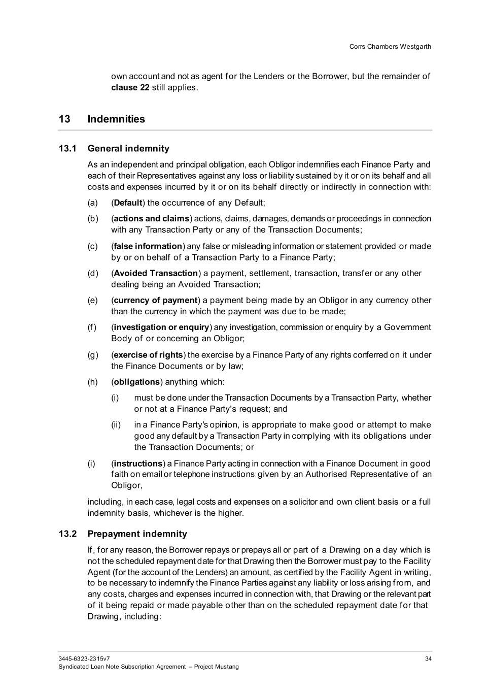Corrs Chambers Westgarth 3445-6323-2315v7 34 Syndicated Loan Note Subscription Agreement – Project Mustang own account and not as agent for the Lenders or the Borrower, but the remainder of clause 22 still applies. 13 Indemnities 13.1 General indemnity As an independent and principal obligation, each Obligor indemnifies each Finance Party and each of their Representatives against any loss or liability sustained by it or on its behalf and all costs and expenses incurred by it or on its behalf directly or indirectly in connection with: (a) (Default) the occurrence of any Default; (b) (actions and claims) actions, claims, damages, demands or proceedings in connection with any Transaction Party or any of the Transaction Documents; (c) (false information) any false or misleading information or statement provided or made by or on behalf of a Transaction Party to a Finance Party; (d) (Avoided Transaction) a payment, settlement, transaction, transfer or any other dealing being an Avoided Transaction; (e) (currency of payment) a payment being made by an Obligor in any currency other than the currency in which the payment was due to be made; (f ) (investigation or enquiry) any investigation, commission or enquiry by a Government Body of or concerning an Obligor; (g) (exercise of rights) the exercise by a Finance Party of any rights conferred on it under the Finance Documents or by law; (h) (obligations) anything which: (i) must be done under the Transaction Documents by a Transaction Party, whether or not at a Finance Party's request; and (ii) in a Finance Party's opinion, is appropriate to make good or attempt to make good any default by a Transaction Party in complying with its obligations under the Transaction Documents; or (i) (instructions) a Finance Party acting in connection with a Finance Document in good faith on email or telephone instructions given by an Authorised Representative of an Obligor, including, in each case, legal costs and expenses on a solicitor and own client basis or a full indemnity basis, whichever is the higher. 13.2 Prepayment indemnity If , for any reason, the Borrower repays or prepays all or part of a Drawing on a day which is not the scheduled repayment date for that Drawing then the Borrower must pay to the Facility Agent (for the account of the Lenders) an amount, as certified by the Facility Agent in writing, to be necessary to indemnify the Finance Parties against any liability or loss arising f rom, and any costs, charges and expenses incurred in connection with, that Drawing or the relevant part of it being repaid or made payable other than on the scheduled repayment date for that Drawing, including: