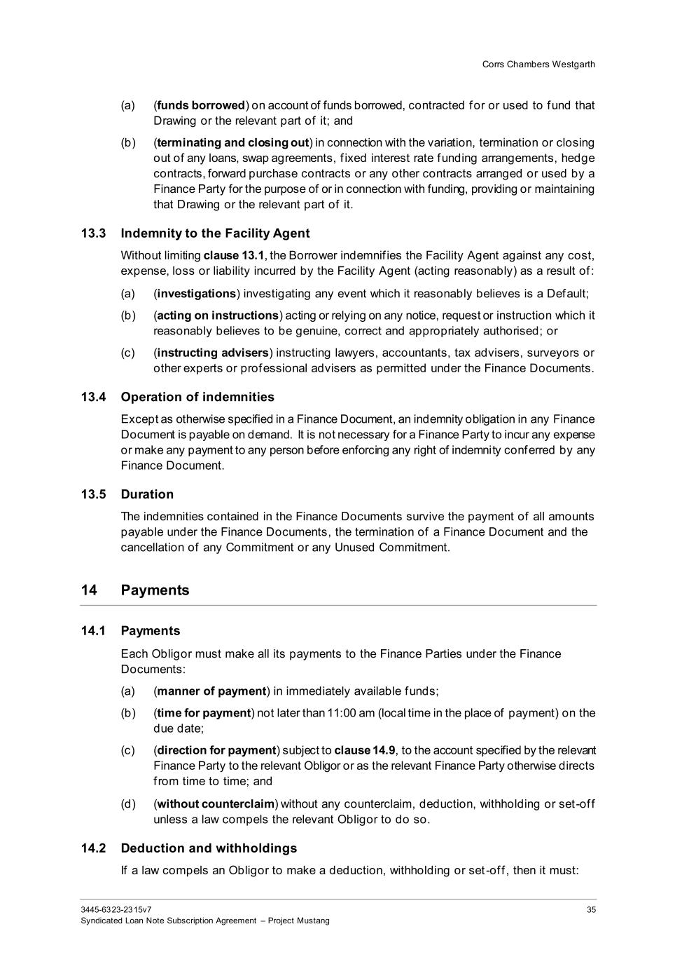 Corrs Chambers Westgarth 3445-6323-2315v7 35 Syndicated Loan Note Subscription Agreement – Project Mustang (a) (funds borrowed) on account of funds borrowed, contracted for or used to fund that Drawing or the relevant part of it; and (b) (terminating and closing out) in connection with the variation, termination or closing out of any loans, swap agreements, f ixed interest rate funding arrangements, hedge contracts, forward purchase contracts or any other contracts arranged or used by a Finance Party for the purpose of or in connection with funding, providing or maintaining that Drawing or the relevant part of it. 13.3 Indemnity to the Facility Agent Without limiting clause 13.1, the Borrower indemnif ies the Facility Agent against any cost, expense, loss or liability incurred by the Facility Agent (acting reasonably) as a result of : (a) (investigations) investigating any event which it reasonably believes is a Default; (b) (acting on instructions) acting or relying on any notice, request or instruction which it reasonably believes to be genuine, correct and appropriately authorised; or (c) (instructing advisers) instructing lawyers, accountants, tax advisers, surveyors or other experts or professional advisers as permitted under the Finance Documents. 13.4 Operation of indemnities Except as otherwise specified in a Finance Document, an indemnity obligation in any Finance Document is payable on demand. It is not necessary for a Finance Party to incur any expense or make any payment to any person before enforcing any right of indemnity conferred by any Finance Document. 13.5 Duration The indemnities contained in the Finance Documents survive the payment of all amounts payable under the Finance Documents, the termination of a Finance Document and the cancellation of any Commitment or any Unused Commitment. 14 Payments 14.1 Payments Each Obligor must make all its payments to the Finance Parties under the Finance Documents: (a) (manner of payment) in immediately available funds; (b) (time for payment) not later than 11:00 am (local time in the place of payment) on the due date; (c) (direction for payment) subject to clause 14.9, to the account specified by the relevant Finance Party to the relevant Obligor or as the relevant Finance Party otherwise directs f rom time to time; and (d) (without counterclaim) without any counterclaim, deduction, withholding or set-of f unless a law compels the relevant Obligor to do so. 14.2 Deduction and withholdings If a law compels an Obligor to make a deduction, withholding or set -of f , then it must: