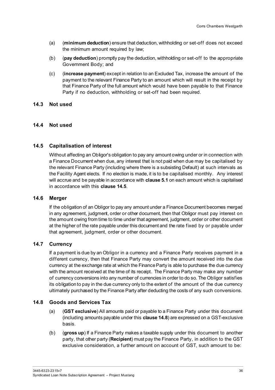 Corrs Chambers Westgarth 3445-6323-2315v7 36 Syndicated Loan Note Subscription Agreement – Project Mustang (a) (minimum deduction) ensure that deduction, withholding or set-of f does not exceed the minimum amount required by law; (b) (pay deduction) promptly pay the deduction, withholding or set-of f to the appropriate Government Body; and (c) (increase payment) except in relation to an Excluded Tax, increase the amount of the payment to the relevant Finance Party to an amount which will result in the receipt by that Finance Party of the full amount which would have been payable to that Finance Party if no deduction, withholding or set-of f had been required. 14.3 Not used 14.4 Not used 14.5 Capitalisation of interest Without affecting an Obligor's obligation to pay any amount owing under or in connection with a Finance Document when due, any interest that is not paid when due may be capitalised by the relevant Finance Party (including where there is a subsisting Default) at such intervals as the Facility Agent elects. If no election is made, it is to be capitalised monthly. Any interest will accrue and be payable in accordance with clause 5.1 on each amount which is capitalised in accordance with this clause 14.5. 14.6 Merger If the obligation of an Obligor to pay any amount under a Finance Document becomes merged in any agreement, judgment, order or other document, then that Obligor must pay interest on the amount owing from time to time under that agreement, judgment, order or other document at the higher of the rate payable under this document and the rate f ixed by or payable under that agreement, judgment, order or other document. 14.7 Currency If a payment is due by an Obligor in a currency and a Finance Party receives payment in a dif ferent currency, then that Finance Party may convert the amount received into the due currency at the exchange rate at which the Finance Party is able to purchase the due currency with the amount received at the time of its receipt. The Finance Party may make any number of currency conversions into any number of currencies in order to do so. The Obligor satisf ies its obligation to pay in the due currency only to the extent of the amount of the due currency ultimately purchased by the Finance Party after deducting the costs of any such conversions. 14.8 Goods and Services Tax (a) (GST exclusive) All amounts paid or payable to a Finance Party under this document (including amounts payable under this clause 14.8) are expressed on a GST-exclusive basis. (b) (gross up) If a Finance Party makes a taxable supply under this document to another party, that other party (Recipient) must pay the Finance Party, in addition to the GST exclusive consideration, a further amount on account of GST, such amount to be: