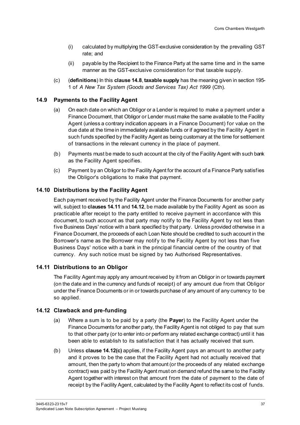 Corrs Chambers Westgarth 3445-6323-2315v7 37 Syndicated Loan Note Subscription Agreement – Project Mustang (i) calculated by multiplying the GST-exclusive consideration by the prevailing GST rate; and (ii) payable by the Recipient to the Finance Party at the same time and in the same manner as the GST-exclusive consideration for that taxable supply. (c) (definitions) In this clause 14.8, taxable supply has the meaning given in section 195- 1 of A New Tax System (Goods and Services Tax) Act 1999 (Cth). 14.9 Payments to the Facility Agent (a) On each date on which an Obligor or a Lender is required to make a payment under a Finance Document, that Obligor or Lender must make the same available to the Facility Agent (unless a contrary indication appears in a Finance Document) for value on the due date at the time in immediately available funds or if agreed by the Facility Agent in such funds specified by the Facility Agent as being customary at the time for settlement of transactions in the relevant currency in the place of payment. (b) Payments must be made to such account at the city of the Facility Agent with such bank as the Facility Agent specif ies. (c) Payment by an Obligor to the Facility Agent for the account of a Finance Party satisf ies the Obligor's obligations to make that payment. 14.10 Distributions by the Facility Agent Each payment received by the Facility Agent under the Finance Documents for another party will, subject to clauses 14.11 and 14.12, be made available by the Facility Agent as soon as practicable af ter receipt to the party entitled to receive payment in accordance with this document, to such account as that party may notify to the Facility Agent by not less than f ive Business Days' notice with a bank specified by that party. Unless provided otherwise in a Finance Document, the proceeds of each Loan Note should be credited to such account in the Borrower’s name as the Borrower may notify to the Facility Agent by not less than f ive Business Days' notice with a bank in the principal f inancial centre of the country of that currency. Any such notice must be signed by two Authorised Representatives. 14.11 Distributions to an Obligor The Facility Agent may apply any amount received by it from an Obligor in or towards payment (on the date and in the currency and funds of receipt) of any amount due f rom that Obligor under the Finance Documents or in or towards purchase of any amount of any currency to be so applied. 14.12 Clawback and pre-funding (a) Where a sum is to be paid by a party (the Payer) to the Facility Agent under the Finance Documents for another party, the Facility Agent is not obliged to pay that sum to that other party (or to enter into or perform any related exchange contract) until it has been able to establish to its satisfaction that it has actually received that sum. (b) Unless clause 14.12(c) applies, if the Facility Agent pays an amount to another party and it proves to be the case that the Facility Agent had not actually received that amount, then the party to whom that amount (or the proceeds of any related exchange contract) was paid by the Facility Agent must on demand refund the same to the Facility Agent together with interest on that amount f rom the date of payment to the date of receipt by the Facility Agent, calculated by the Facility Agent to reflect its cost of funds.