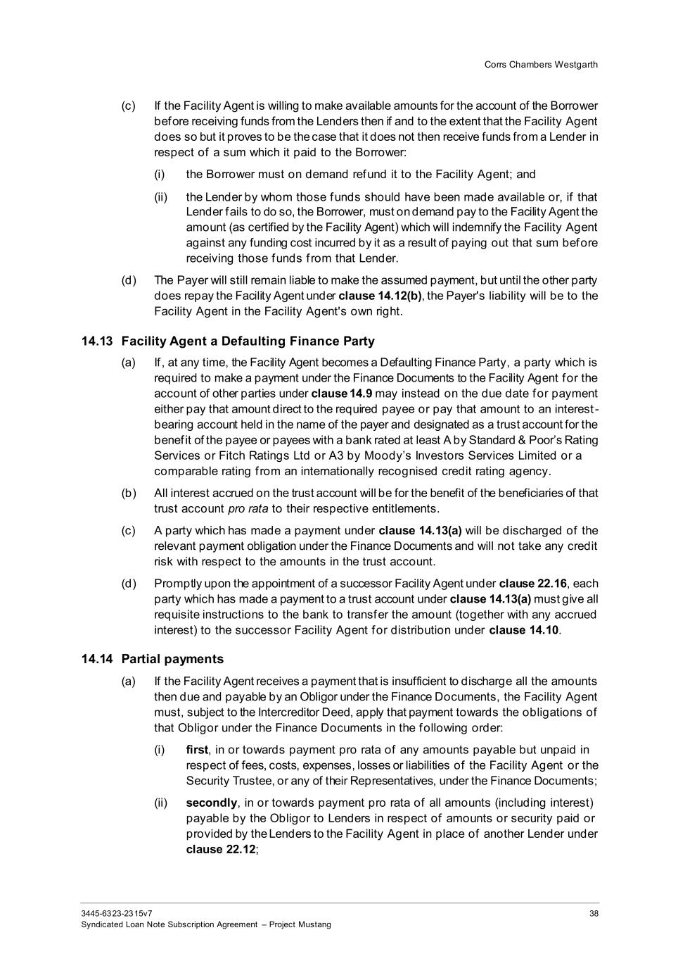 Corrs Chambers Westgarth 3445-6323-2315v7 38 Syndicated Loan Note Subscription Agreement – Project Mustang (c) If the Facility Agent is willing to make available amounts for the account of the Borrower before receiving funds from the Lenders then if and to the extent that the Facility Agent does so but it proves to be the case that it does not then receive funds from a Lender in respect of a sum which it paid to the Borrower: (i) the Borrower must on demand refund it to the Facility Agent; and (ii) the Lender by whom those funds should have been made available or, if that Lender fails to do so, the Borrower, must on demand pay to the Facility Agent the amount (as certified by the Facility Agent) which will indemnify the Facility Agent against any funding cost incurred by it as a result of paying out that sum before receiving those funds f rom that Lender. (d) The Payer will still remain liable to make the assumed payment, but until the other party does repay the Facility Agent under clause 14.12(b), the Payer's liability will be to the Facility Agent in the Facility Agent's own right. 14.13 Facility Agent a Defaulting Finance Party (a) If , at any time, the Facility Agent becomes a Defaulting Finance Party, a party which is required to make a payment under the Finance Documents to the Facility Agent for the account of other parties under clause 14.9 may instead on the due date for payment either pay that amount direct to the required payee or pay that amount to an interest - bearing account held in the name of the payer and designated as a trust account for the benef it of the payee or payees with a bank rated at least A by Standard & Poor’s Rating Services or Fitch Ratings Ltd or A3 by Moody’s Investors Services Limited or a comparable rating f rom an internationally recognised credit rating agency. (b) All interest accrued on the trust account will be for the benefit of the beneficiaries of that trust account pro rata to their respective entitlements. (c) A party which has made a payment under clause 14.13(a) will be discharged of the relevant payment obligation under the Finance Documents and will not take any credit risk with respect to the amounts in the trust account. (d) Promptly upon the appointment of a successor Facility Agent under clause 22.16, each party which has made a payment to a trust account under clause 14.13(a) must give all requisite instructions to the bank to transfer the amount (together with any accrued interest) to the successor Facility Agent for distribution under clause 14.10. 14.14 Partial payments (a) If the Facility Agent receives a payment that is insufficient to discharge all the amounts then due and payable by an Obligor under the Finance Documents, the Facility Agent must, subject to the Intercreditor Deed, apply that payment towards the obligations of that Obligor under the Finance Documents in the following order: (i) first, in or towards payment pro rata of any amounts payable but unpaid in respect of fees, costs, expenses, losses or liabilities of the Facility Agent or the Security Trustee, or any of their Representatives, under the Finance Documents; (ii) secondly, in or towards payment pro rata of all amounts (including interest) payable by the Obligor to Lenders in respect of amounts or security paid or provided by the Lenders to the Facility Agent in place of another Lender under clause 22.12;