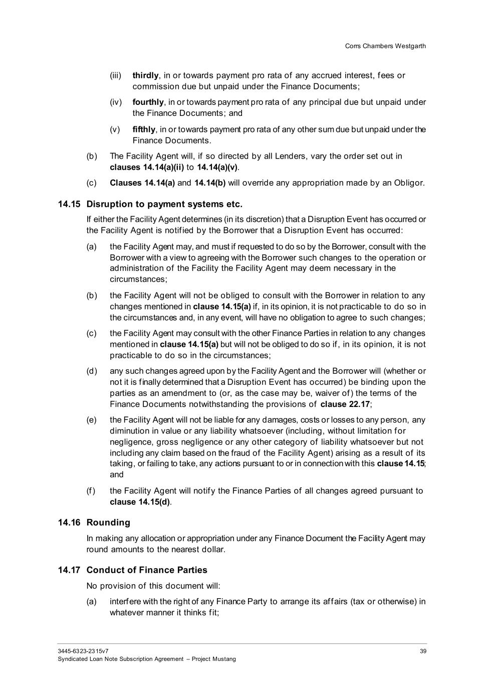 Corrs Chambers Westgarth 3445-6323-2315v7 39 Syndicated Loan Note Subscription Agreement – Project Mustang (iii) thirdly, in or towards payment pro rata of any accrued interest, fees or commission due but unpaid under the Finance Documents; (iv) fourthly, in or towards payment pro rata of any principal due but unpaid under the Finance Documents; and (v) fifthly, in or towards payment pro rata of any other sum due but unpaid under the Finance Documents. (b) The Facility Agent will, if so directed by all Lenders, vary the order set out in clauses 14.14(a)(ii) to 14.14(a)(v). (c) Clauses 14.14(a) and 14.14(b) will override any appropriation made by an Obligor. 14.15 Disruption to payment systems etc. If either the Facility Agent determines (in its discretion) that a Disruption Event has occurred or the Facility Agent is notif ied by the Borrower that a Disruption Event has occurred: (a) the Facility Agent may, and must if requested to do so by the Borrower, consult with the Borrower with a view to agreeing with the Borrower such changes to the operation or administration of the Facility the Facility Agent may deem necessary in the circumstances; (b) the Facility Agent will not be obliged to consult with the Borrower in relation to any changes mentioned in clause 14.15(a) if, in its opinion, it is not practicable to do so in the circumstances and, in any event, will have no obligation to agree to such changes; (c) the Facility Agent may consult with the other Finance Parties in relation to any changes mentioned in clause 14.15(a) but will not be obliged to do so if , in its opinion, it is not practicable to do so in the circumstances; (d) any such changes agreed upon by the Facility Agent and the Borrower will (whether or not it is f inally determined that a Disruption Event has occurred) be binding upon the parties as an amendment to (or, as the case may be, waiver of ) the terms of the Finance Documents notwithstanding the provisions of clause 22.17; (e) the Facility Agent will not be liable for any damages, costs or losses to any person, any diminution in value or any liability whatsoever (including, without limitation for negligence, gross negligence or any other category of liability whatsoever but not including any claim based on the fraud of the Facility Agent) arising as a result of its taking, or failing to take, any actions pursuant to or in connection with this clause 14.15; and (f ) the Facility Agent will notify the Finance Parties of all changes agreed pursuant to clause 14.15(d). 14.16 Rounding In making any allocation or appropriation under any Finance Document the Facility Agent may round amounts to the nearest dollar. 14.17 Conduct of Finance Parties No provision of this document will: (a) interfere with the right of any Finance Party to arrange its af fairs (tax or otherwise) in whatever manner it thinks f it;