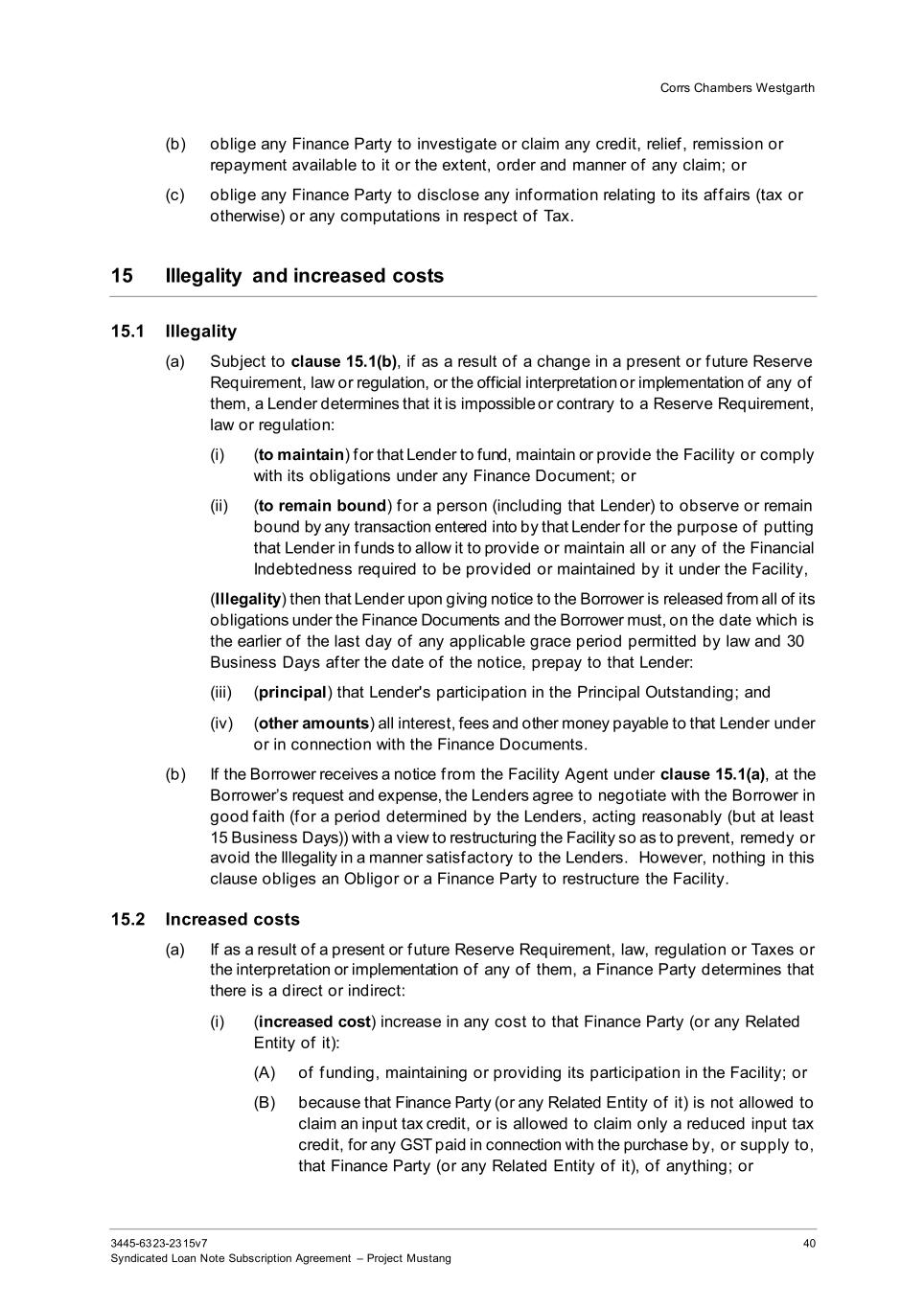 Corrs Chambers Westgarth 3445-6323-2315v7 40 Syndicated Loan Note Subscription Agreement – Project Mustang (b) oblige any Finance Party to investigate or claim any credit, relief , remission or repayment available to it or the extent, order and manner of any claim; or (c) oblige any Finance Party to disclose any information relating to its af fairs (tax or otherwise) or any computations in respect of Tax. 15 Illegality and increased costs 15.1 Illegality (a) Subject to clause 15.1(b), if as a result of a change in a present or future Reserve Requirement, law or regulation, or the official interpretation or implementation of any of them, a Lender determines that it is impossible or contrary to a Reserve Requirement, law or regulation: (i) (to maintain) for that Lender to fund, maintain or provide the Facility or comply with its obligations under any Finance Document; or (ii) (to remain bound) for a person (including that Lender) to observe or remain bound by any transaction entered into by that Lender for the purpose of putting that Lender in funds to allow it to provide or maintain all or any of the Financial Indebtedness required to be provided or maintained by it under the Facility, (Illegality) then that Lender upon giving notice to the Borrower is released from all of its obligations under the Finance Documents and the Borrower must, on the date which is the earlier of the last day of any applicable grace period permitted by law and 30 Business Days af ter the date of the notice, prepay to that Lender: (iii) (principal) that Lender's participation in the Principal Outstanding; and (iv) (other amounts) all interest, fees and other money payable to that Lender under or in connection with the Finance Documents. (b) If the Borrower receives a notice f rom the Facility Agent under clause 15.1(a), at the Borrower’s request and expense, the Lenders agree to negotiate with the Borrower in good faith (for a period determined by the Lenders, acting reasonably (but at least 15 Business Days)) with a view to restructuring the Facility so as to prevent, remedy or avoid the Illegality in a manner satisfactory to the Lenders. However, nothing in this clause obliges an Obligor or a Finance Party to restructure the Facility. 15.2 Increased costs (a) If as a result of a present or future Reserve Requirement, law, regulation or Taxes or the interpretation or implementation of any of them, a Finance Party determines that there is a direct or indirect: (i) (increased cost) increase in any cost to that Finance Party (or any Related Entity of it): (A) of funding, maintaining or providing its participation in the Facility; or (B) because that Finance Party (or any Related Entity of it) is not allowed to claim an input tax credit, or is allowed to claim only a reduced input tax credit, for any GST paid in connection with the purchase by, or supply to, that Finance Party (or any Related Entity of it), of anything; or