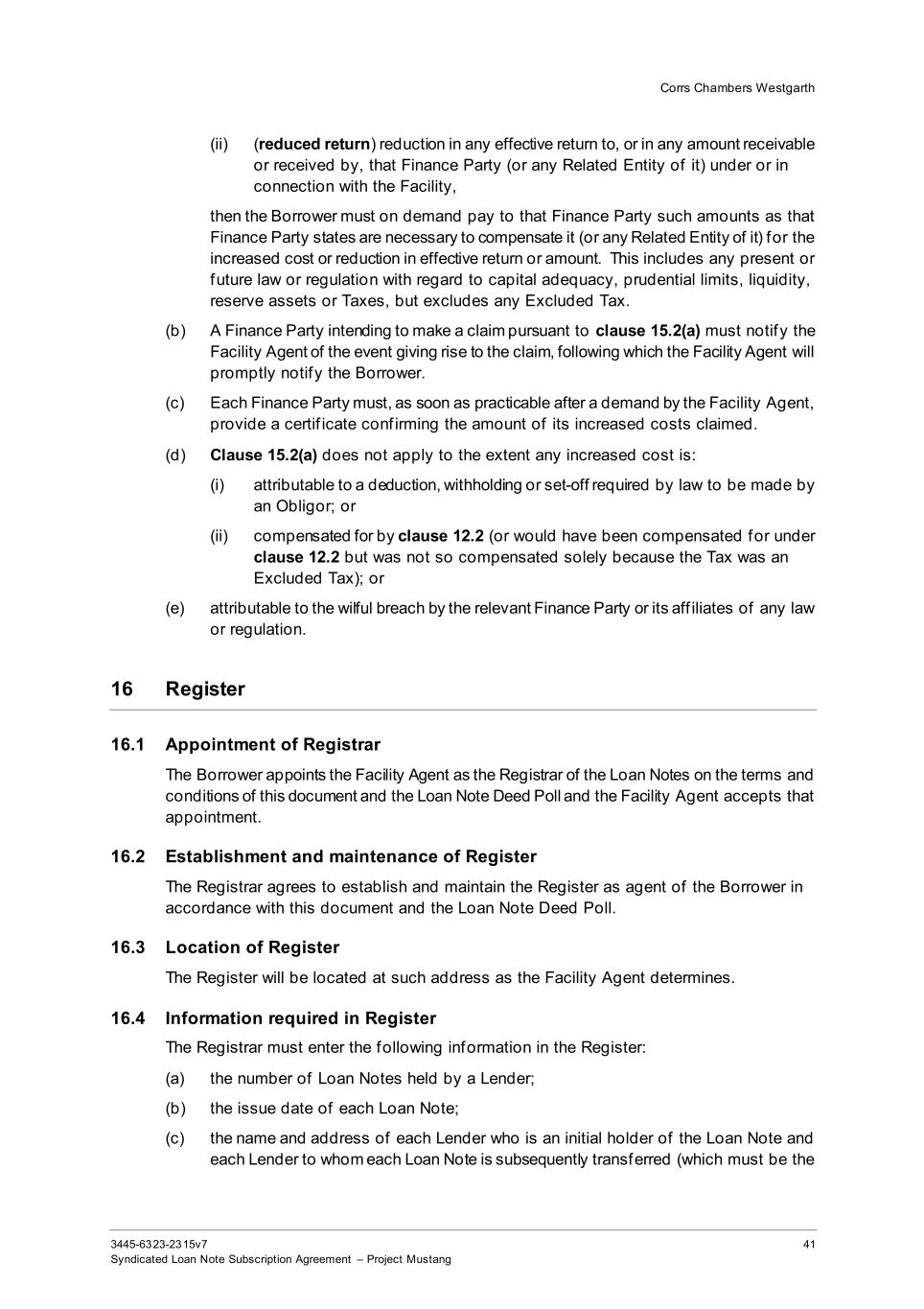 Corrs Chambers Westgarth 3445-6323-2315v7 41 Syndicated Loan Note Subscription Agreement – Project Mustang (ii) (reduced return) reduction in any effective return to, or in any amount receivable or received by, that Finance Party (or any Related Entity of it) under or in connection with the Facility, then the Borrower must on demand pay to that Finance Party such amounts as that Finance Party states are necessary to compensate it (or any Related Entity of it) for the increased cost or reduction in effective return or amount. This includes any present or future law or regulation with regard to capital adequacy, prudential limits, liquidity, reserve assets or Taxes, but excludes any Excluded Tax. (b) A Finance Party intending to make a claim pursuant to clause 15.2(a) must notify the Facility Agent of the event giving rise to the claim, following which the Facility Agent will promptly notify the Borrower. (c) Each Finance Party must, as soon as practicable after a demand by the Facility Agent, provide a certif icate conf irming the amount of its increased costs claimed. (d) Clause 15.2(a) does not apply to the extent any increased cost is: (i) attributable to a deduction, withholding or set-off required by law to be made by an Obligor; or (ii) compensated for by clause 12.2 (or would have been compensated for under clause 12.2 but was not so compensated solely because the Tax was an Excluded Tax); or (e) attributable to the wilful breach by the relevant Finance Party or its aff iliates of any law or regulation. 16 Register 16.1 Appointment of Registrar The Borrower appoints the Facility Agent as the Registrar of the Loan Notes on the terms and conditions of this document and the Loan Note Deed Poll and the Facility Agent accepts that appointment. 16.2 Establishment and maintenance of Register The Registrar agrees to establish and maintain the Register as agent of the Borrower in accordance with this document and the Loan Note Deed Poll. 16.3 Location of Register The Register will be located at such address as the Facility Agent determines. 16.4 Information required in Register The Registrar must enter the following information in the Register: (a) the number of Loan Notes held by a Lender; (b) the issue date of each Loan Note; (c) the name and address of each Lender who is an initial holder of the Loan Note and each Lender to whom each Loan Note is subsequently transferred (which must be the