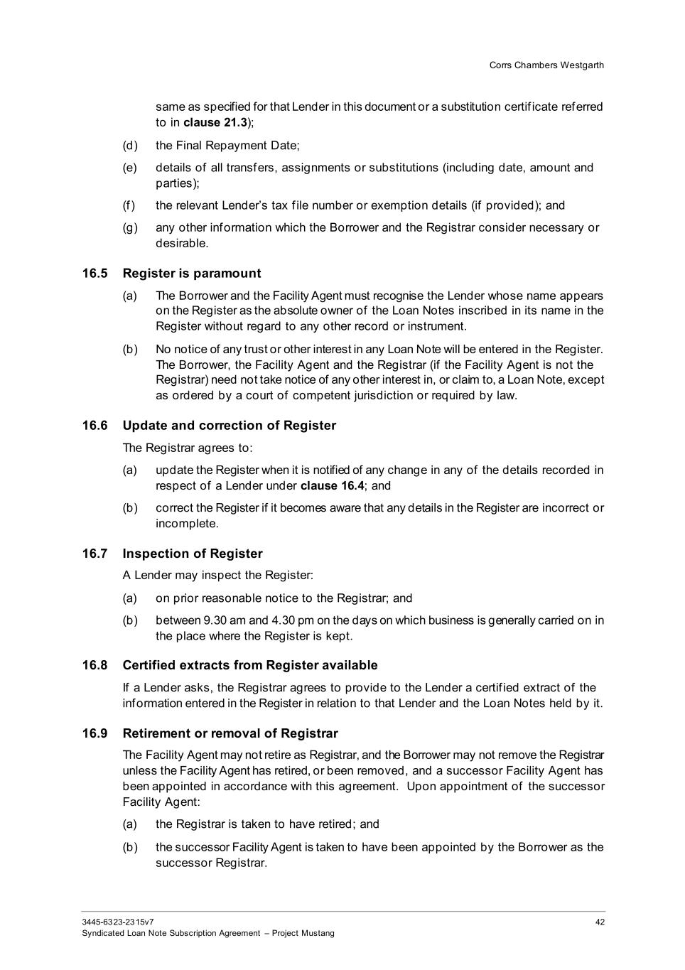 Corrs Chambers Westgarth 3445-6323-2315v7 42 Syndicated Loan Note Subscription Agreement – Project Mustang same as specified for that Lender in this document or a substitution certif icate referred to in clause 21.3); (d) the Final Repayment Date; (e) details of all transfers, assignments or substitutions (including date, amount and parties); (f ) the relevant Lender’s tax f ile number or exemption details (if provided); and (g) any other information which the Borrower and the Registrar consider necessary or desirable. 16.5 Register is paramount (a) The Borrower and the Facility Agent must recognise the Lender whose name appears on the Register as the absolute owner of the Loan Notes inscribed in its name in the Register without regard to any other record or instrument. (b) No notice of any trust or other interest in any Loan Note will be entered in the Register. The Borrower, the Facility Agent and the Registrar (if the Facility Agent is not the Registrar) need not take notice of any other interest in, or claim to, a Loan Note, except as ordered by a court of competent jurisdiction or required by law. 16.6 Update and correction of Register The Registrar agrees to: (a) update the Register when it is notified of any change in any of the details recorded in respect of a Lender under clause 16.4; and (b) correct the Register if it becomes aware that any details in the Register are incorrect or incomplete. 16.7 Inspection of Register A Lender may inspect the Register: (a) on prior reasonable notice to the Registrar; and (b) between 9.30 am and 4.30 pm on the days on which business is generally carried on in the place where the Register is kept. 16.8 Certified extracts from Register available If a Lender asks, the Registrar agrees to provide to the Lender a certif ied extract of the information entered in the Register in relation to that Lender and the Loan Notes held by it. 16.9 Retirement or removal of Registrar The Facility Agent may not retire as Registrar, and the Borrower may not remove the Registrar unless the Facility Agent has retired, or been removed, and a successor Facility Agent has been appointed in accordance with this agreement. Upon appointment of the successor Facility Agent: (a) the Registrar is taken to have retired; and (b) the successor Facility Agent is taken to have been appointed by the Borrower as the successor Registrar.