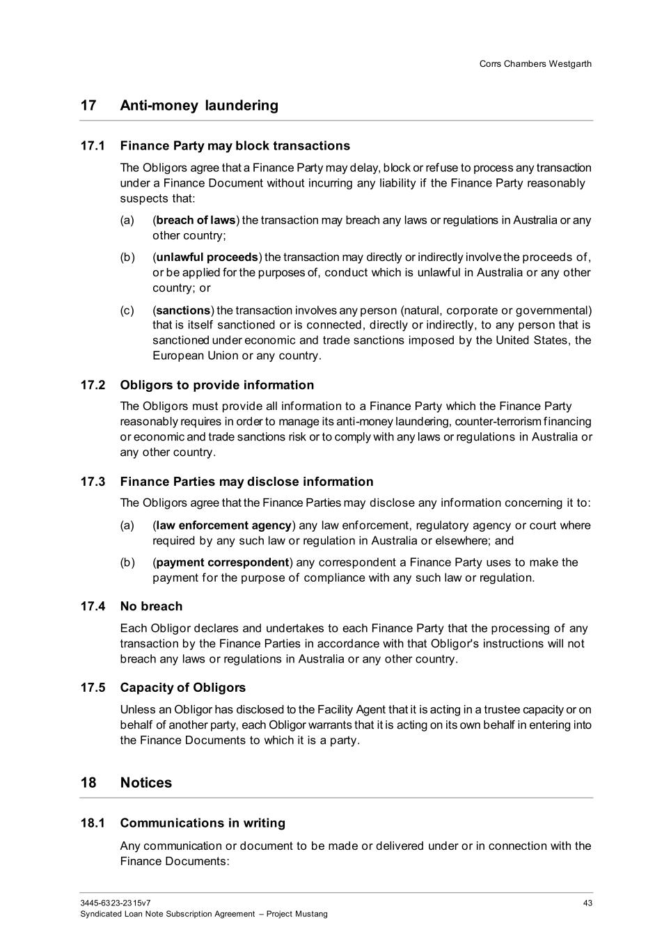 Corrs Chambers Westgarth 3445-6323-2315v7 43 Syndicated Loan Note Subscription Agreement – Project Mustang 17 Anti-money laundering 17.1 Finance Party may block transactions The Obligors agree that a Finance Party may delay, block or refuse to process any transaction under a Finance Document without incurring any liability if the Finance Party reasonably suspects that: (a) (breach of laws) the transaction may breach any laws or regulations in Australia or any other country; (b) (unlawful proceeds) the transaction may directly or indirectly involve the proceeds of , or be applied for the purposes of, conduct which is unlawful in Australia or any other country; or (c) (sanctions) the transaction involves any person (natural, corporate or governmental) that is itself sanctioned or is connected, directly or indirectly, to any person that is sanctioned under economic and trade sanctions imposed by the United States, the European Union or any country. 17.2 Obligors to provide information The Obligors must provide all information to a Finance Party which the Finance Party reasonably requires in order to manage its anti-money laundering, counter-terrorism f inancing or economic and trade sanctions risk or to comply with any laws or regulations in Australia or any other country. 17.3 Finance Parties may disclose information The Obligors agree that the Finance Parties may disclose any information concerning it to: (a) (law enforcement agency) any law enforcement, regulatory agency or court where required by any such law or regulation in Australia or elsewhere; and (b) (payment correspondent) any correspondent a Finance Party uses to make the payment for the purpose of compliance with any such law or regulation. 17.4 No breach Each Obligor declares and undertakes to each Finance Party that the processing of any transaction by the Finance Parties in accordance with that Obligor's instructions will not breach any laws or regulations in Australia or any other country. 17.5 Capacity of Obligors Unless an Obligor has disclosed to the Facility Agent that it is acting in a trustee capacity or on behalf of another party, each Obligor warrants that it is acting on its own behalf in entering into the Finance Documents to which it is a party. 18 Notices 18.1 Communications in writing Any communication or document to be made or delivered under or in connection with the Finance Documents: