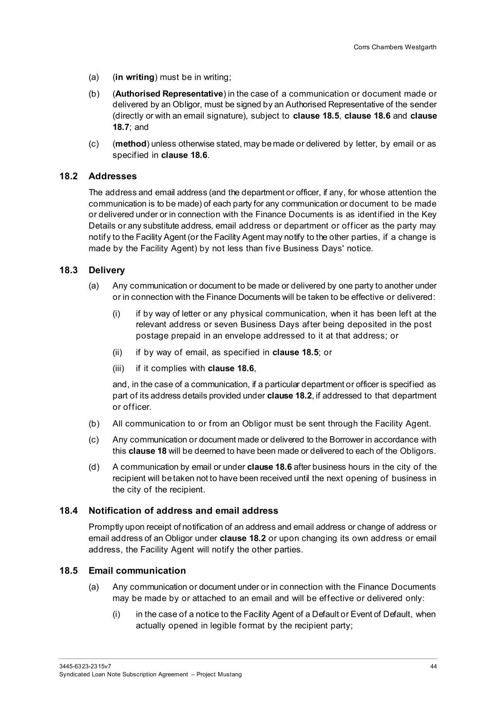 Corrs Chambers Westgarth 3445-6323-2315v7 44 Syndicated Loan Note Subscription Agreement – Project Mustang (a) (in writing) must be in writing; (b) (Authorised Representative) in the case of a communication or document made or delivered by an Obligor, must be signed by an Authorised Representative of the sender (directly or with an email signature), subject to clause 18.5, clause 18.6 and clause 18.7; and (c) (method) unless otherwise stated, may be made or delivered by letter, by email or as specif ied in clause 18.6. 18.2 Addresses The address and email address (and the department or officer, if any, for whose attention the communication is to be made) of each party for any communication or document to be made or delivered under or in connection with the Finance Documents is as ident if ied in the Key Details or any substitute address, email address or department or of f icer as the party may notify to the Facility Agent (or the Facility Agent may notify to the other parties, if a change is made by the Facility Agent) by not less than f ive Business Days' notice. 18.3 Delivery (a) Any communication or document to be made or delivered by one party to another under or in connection with the Finance Documents will be taken to be effective or delivered: (i) if by way of letter or any physical communication, when it has been lef t at the relevant address or seven Business Days af ter being deposited in the post postage prepaid in an envelope addressed to it at that address; or (ii) if by way of email, as specif ied in clause 18.5; or (iii) if it complies with clause 18.6, and, in the case of a communication, if a particular department or officer is specif ied as part of its address details provided under clause 18.2, if addressed to that department or of f icer. (b) All communication to or f rom an Obligor must be sent through the Facility Agent. (c) Any communication or document made or delivered to the Borrower in accordance with this clause 18 will be deemed to have been made or delivered to each of the Obligors. (d) A communication by email or under clause 18.6 after business hours in the city of the recipient will be taken not to have been received until the next opening of business in the city of the recipient. 18.4 Notification of address and email address Promptly upon receipt of notification of an address and email address or change of address or email address of an Obligor under clause 18.2 or upon changing its own address or email address, the Facility Agent will notify the other parties. 18.5 Email communication (a) Any communication or document under or in connection with the Finance Documents may be made by or attached to an email and will be ef fective or delivered only: (i) in the case of a notice to the Facility Agent of a Default or Event of Default, when actually opened in legible format by the recipient party;