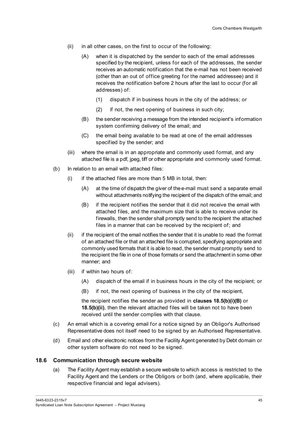 Corrs Chambers Westgarth 3445-6323-2315v7 45 Syndicated Loan Note Subscription Agreement – Project Mustang (ii) in all other cases, on the f irst to occur of the following: (A) when it is dispatched by the sender to each of the email addresses specified by the recipient, unless for each of the addresses, the sender receives an automatic notif ication that the e-mail has not been received (other than an out of of f ice greeting for the named addressee) and it receives the notif ication before 2 hours af ter the last to occur (for all addresses) of : (1) dispatch if in business hours in the city of the address; or (2) if not, the next opening of business in such city; (B) the sender receiving a message from the intended recipient's information system conf irming delivery of the email; and (C) the email being available to be read at one of the email addresses specif ied by the sender; and (iii) where the email is in an appropriate and commonly used format, and any attached file is a pdf, jpeg, tiff or other appropriate and commonly used format. (b) In relation to an email with attached f iles: (i) if the attached f iles are more than 5 MB in total, then: (A) at the time of dispatch the giver of the e-mail must send a separate email without attachments notifying the recipient of the dispatch of the email; and (B) if the recipient notif ies the sender that it did not receive the email with attached f iles, and the maximum size that is able to receive under its f irewalls, then the sender shall promptly send to the recipient the attached f iles in a manner that can be received by the recipient of ; and (ii) if the recipient of the email notifies the sender that it is unable to read the format of an attached file or that an attached file is corrupted, specifying appropriate and commonly used formats that it is able to read, the sender must promptly send to the recipient the file in one of those formats or send the attachment in some other manner; and (iii) if within two hours of : (A) dispatch of the email if in business hours in the city of the recipient; or (B) if not, the next opening of business in the city of the recipient, the recipient notif ies the sender as provided in clauses 18.5(b)(i)(B) or 18.5(b)(ii), then the relevant attached f iles will be taken not to have been received until the sender complies with that clause. (c) An email which is a covering email for a notice signed by an Obligor's Authorised Representative does not itself need to be signed by an Authorised Representative. (d) Email and other electronic notices from the Facility Agent generated by Debt domain or other system sof tware do not need to be signed. 18.6 Communication through secure website (a) The Facility Agent may establish a secure website to which access is restricted to the Facility Agent and the Lenders or the Obligors or both (and, where applicable, their respective f inancial and legal advisers).