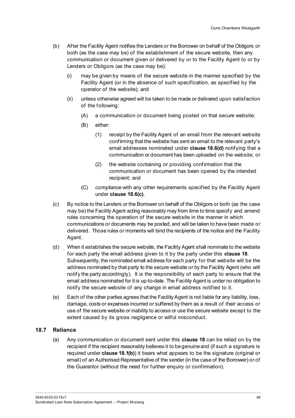 Corrs Chambers Westgarth 3445-6323-2315v7 46 Syndicated Loan Note Subscription Agreement – Project Mustang (b) Af ter the Facility Agent notifies the Lenders or the Borrower on behalf of the Obligors or both (as the case may be) of the establishment of the secure website, then any communication or document given or delivered by or to the Facility Agent to or by Lenders or Obligors (as the case may be): (i) may be given by means of the secure website in the manner specif ied by the Facility Agent (or in the absence of such specif ication, as specif ied by the operator of the website); and (ii) unless otherwise agreed will be taken to be made or delivered upon satisfaction of the following: (A) a communication or document being posted on that secure website; (B) either: (1) receipt by the Facility Agent of an email f rom the relevant website conf irming that the website has sent an email to the relevant party's email addresses nominated under clause 18.6(d) notifying that a communication or document has been uploaded on the website; or (2) the website containing or providing conf irmation that the communication or document has been opened by the intended recipient; and (C) compliance with any other requirements specif ied by the Facility Agent under clause 18.6(c). (c) By notice to the Lenders or the Borrower on behalf of the Obligors or both (as the case may be) the Facility Agent acting reasonably may from time to time specify and amend rules concerning the operation of the secure website in the manner in which communications or documents may be posted, and will be taken to have been made or delivered. Those rules or moments will bind the recipients of the notice and the Facility Agent. (d) When it establishes the secure website, the Facility Agent shall nominate to the website for each party the email address given to it by the party under this clause 18. Subsequently, the nominated email address for each party for that website will be the address nominated by that party to the secure website or by the Facility Agent (who will notify the party accordingly). It is the responsibility of each party to ensure that the email address nominated for it is up-to-date. The Facility Agent is under no obligation to notify the secure website of any change in email address notif ied to it. (e) Each of the other parties agrees that the Facility Agent is not liable for any liability, loss, damage, costs or expenses incurred or suffered by them as a result of their access or use of the secure website or inability to access or use the secure website except to the extent caused by its gross negligence or wilful misconduct. 18.7 Reliance (a) Any communication or document sent under this clause 18 can be relied on by the recipient if the recipient reasonably believes it to be genuine and (if such a signature is required under clause 18.1(b)) it bears what appears to be the signature (original or email) of an Authorised Representative of the sender (in the case of the Borrower) or of the Guarantor (without the need for further enquiry or conf irmation).