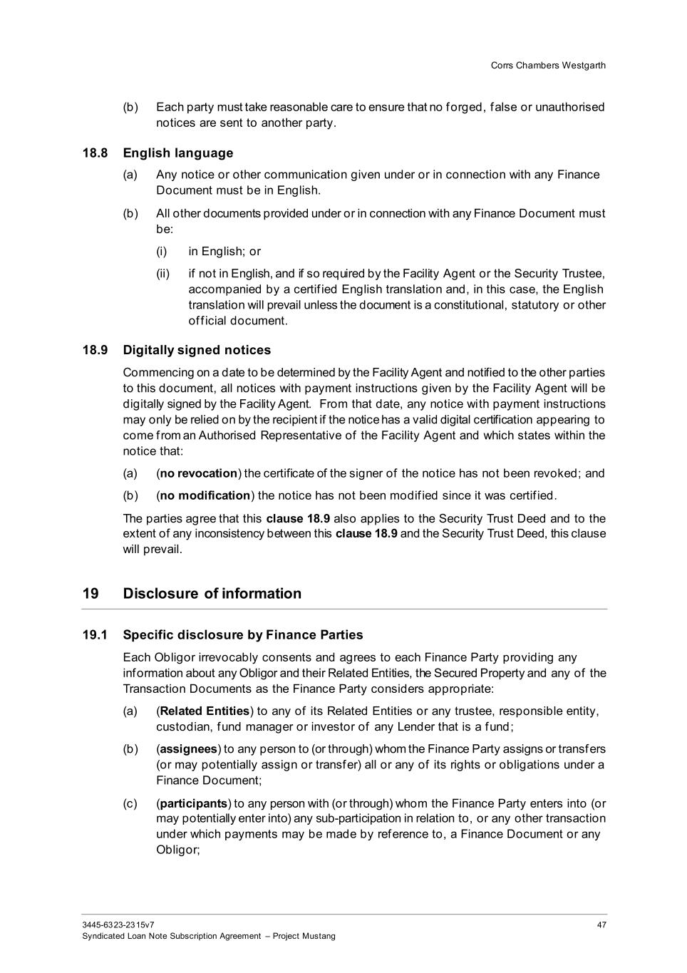 Corrs Chambers Westgarth 3445-6323-2315v7 47 Syndicated Loan Note Subscription Agreement – Project Mustang (b) Each party must take reasonable care to ensure that no forged, false or unauthorised notices are sent to another party. 18.8 English language (a) Any notice or other communication given under or in connection with any Finance Document must be in English. (b) All other documents provided under or in connection with any Finance Document must be: (i) in English; or (ii) if not in English, and if so required by the Facility Agent or the Security Trustee, accompanied by a certif ied English translation and, in this case, the English translation will prevail unless the document is a constitutional, statutory or other of f icial document. 18.9 Digitally signed notices Commencing on a date to be determined by the Facility Agent and notified to the other parties to this document, all notices with payment instructions given by the Facility Agent will be digitally signed by the Facility Agent. From that date, any notice with payment instructions may only be relied on by the recipient if the notice has a valid digital certification appearing to come f rom an Authorised Representative of the Facility Agent and which states within the notice that: (a) (no revocation) the certificate of the signer of the notice has not been revoked; and (b) (no modification) the notice has not been modif ied since it was certif ied. The parties agree that this clause 18.9 also applies to the Security Trust Deed and to the extent of any inconsistency between this clause 18.9 and the Security Trust Deed, this clause will prevail. 19 Disclosure of information 19.1 Specific disclosure by Finance Parties Each Obligor irrevocably consents and agrees to each Finance Party providing any information about any Obligor and their Related Entities, the Secured Property and any of the Transaction Documents as the Finance Party considers appropriate: (a) (Related Entities) to any of its Related Entities or any trustee, responsible entity, custodian, fund manager or investor of any Lender that is a fund; (b) (assignees) to any person to (or through) whom the Finance Party assigns or transfers (or may potentially assign or transfer) all or any of its rights or obligations under a Finance Document; (c) (participants) to any person with (or through) whom the Finance Party enters into (or may potentially enter into) any sub-participation in relation to, or any other transaction under which payments may be made by reference to, a Finance Document or any Obligor;