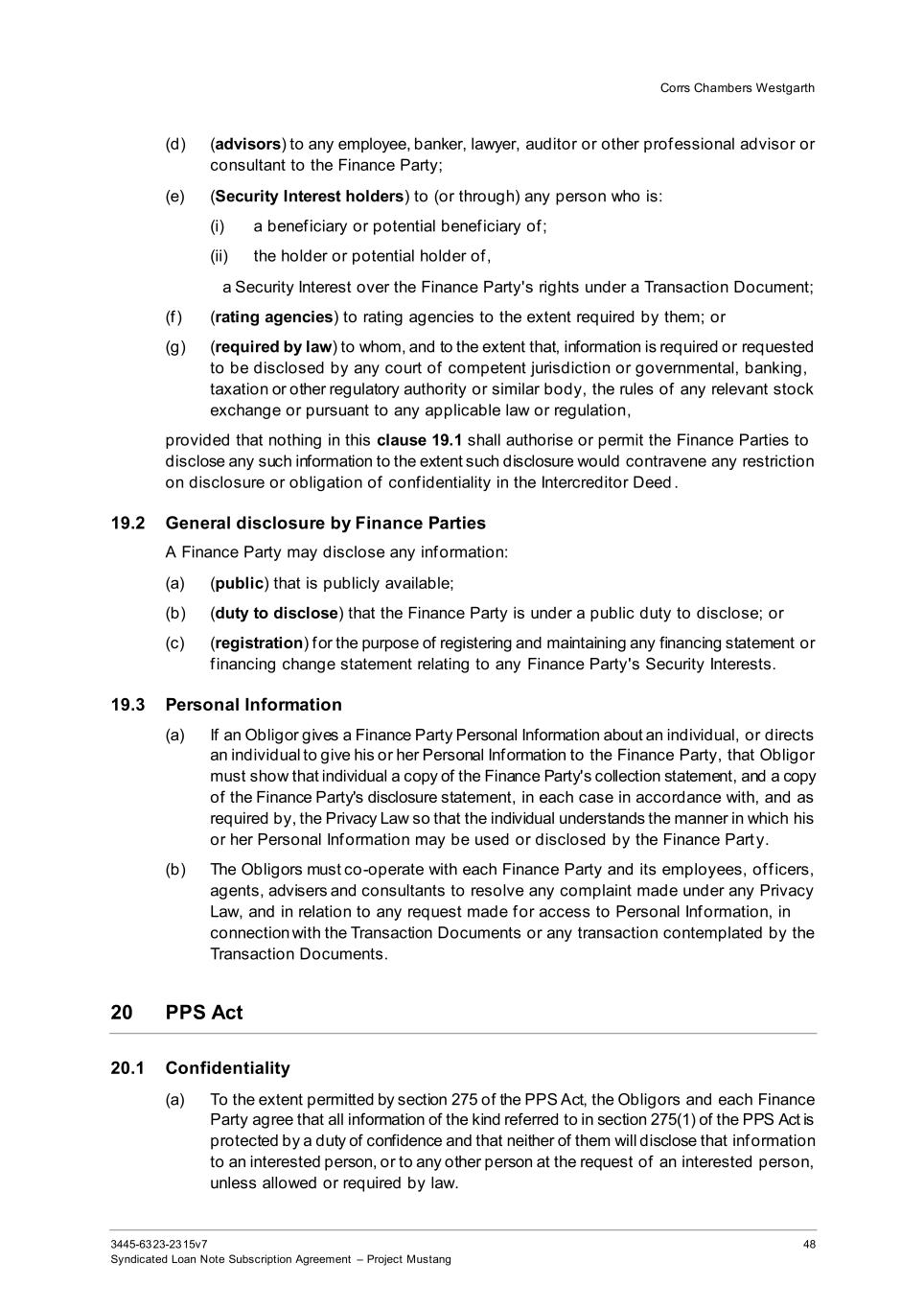 Corrs Chambers Westgarth 3445-6323-2315v7 48 Syndicated Loan Note Subscription Agreement – Project Mustang (d) (advisors) to any employee, banker, lawyer, auditor or other professional advisor or consultant to the Finance Party; (e) (Security Interest holders) to (or through) any person who is: (i) a benef iciary or potential benef iciary of ; (ii) the holder or potential holder of , a Security Interest over the Finance Party's rights under a Transaction Document; (f ) (rating agencies) to rating agencies to the extent required by them; or (g) (required by law) to whom, and to the extent that, information is required or requested to be disclosed by any court of competent jurisdiction or governmental, banking, taxation or other regulatory authority or similar body, the rules of any relevant stock exchange or pursuant to any applicable law or regulation, provided that nothing in this clause 19.1 shall authorise or permit the Finance Parties to disclose any such information to the extent such disclosure would contravene any restriction on disclosure or obligation of conf identiality in the Intercreditor Deed . 19.2 General disclosure by Finance Parties A Finance Party may disclose any information: (a) (public) that is publicly available; (b) (duty to disclose) that the Finance Party is under a public duty to disclose; or (c) (registration) for the purpose of registering and maintaining any financing statement or f inancing change statement relating to any Finance Party's Security Interests. 19.3 Personal Information (a) If an Obligor gives a Finance Party Personal Information about an individual, or directs an individual to give his or her Personal Information to the Finance Party, that Obligor must show that individual a copy of the Finance Party's collection statement, and a copy of the Finance Party's disclosure statement, in each case in accordance with, and as required by, the Privacy Law so that the individual understands the manner in which his or her Personal Information may be used or disclosed by the Finance Party. (b) The Obligors must co-operate with each Finance Party and its employees, of f icers, agents, advisers and consultants to resolve any complaint made under any Privacy Law, and in relation to any request made for access to Personal Information, in connection with the Transaction Documents or any transaction contemplated by the Transaction Documents. 20 PPS Act 20.1 Confidentiality (a) To the extent permitted by section 275 of the PPS Act, the Obligors and each Finance Party agree that all information of the kind referred to in section 275(1) of the PPS Act is protected by a duty of confidence and that neither of them will disclose that information to an interested person, or to any other person at the request of an interested person, unless allowed or required by law.