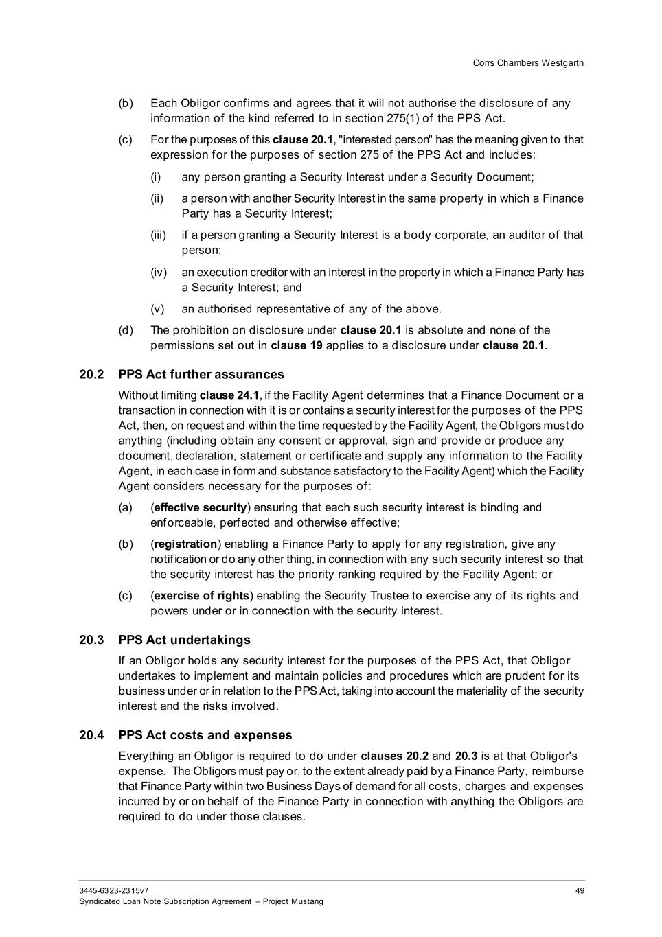 Corrs Chambers Westgarth 3445-6323-2315v7 49 Syndicated Loan Note Subscription Agreement – Project Mustang (b) Each Obligor conf irms and agrees that it will not authorise the disclosure of any information of the kind referred to in section 275(1) of the PPS Act. (c) For the purposes of this clause 20.1, "interested person" has the meaning given to that expression for the purposes of section 275 of the PPS Act and includes: (i) any person granting a Security Interest under a Security Document; (ii) a person with another Security Interest in the same property in which a Finance Party has a Security Interest; (iii) if a person granting a Security Interest is a body corporate, an auditor of that person; (iv) an execution creditor with an interest in the property in which a Finance Party has a Security Interest; and (v) an authorised representative of any of the above. (d) The prohibition on disclosure under clause 20.1 is absolute and none of the permissions set out in clause 19 applies to a disclosure under clause 20.1. 20.2 PPS Act further assurances Without limiting clause 24.1, if the Facility Agent determines that a Finance Document or a transaction in connection with it is or contains a security interest for the purposes of the PPS Act, then, on request and within the time requested by the Facility Agent, the Obligors must do anything (including obtain any consent or approval, sign and provide or produce any document, declaration, statement or certif icate and supply any information to the Facility Agent, in each case in form and substance satisfactory to the Facility Agent) which the Facility Agent considers necessary for the purposes of : (a) (effective security) ensuring that each such security interest is binding and enforceable, perfected and otherwise ef fective; (b) (registration) enabling a Finance Party to apply for any registration, give any notif ication or do any other thing, in connection with any such security interest so that the security interest has the priority ranking required by the Facility Agent; or (c) (exercise of rights) enabling the Security Trustee to exercise any of its rights and powers under or in connection with the security interest. 20.3 PPS Act undertakings If an Obligor holds any security interest for the purposes of the PPS Act, that Obligor undertakes to implement and maintain policies and procedures which are prudent for its business under or in relation to the PPS Act, taking into account the materiality of the security interest and the risks involved. 20.4 PPS Act costs and expenses Everything an Obligor is required to do under clauses 20.2 and 20.3 is at that Obligor's expense. The Obligors must pay or, to the extent already paid by a Finance Party, reimburse that Finance Party within two Business Days of demand for all costs, charges and expenses incurred by or on behalf of the Finance Party in connection with anything the Obligors are required to do under those clauses.