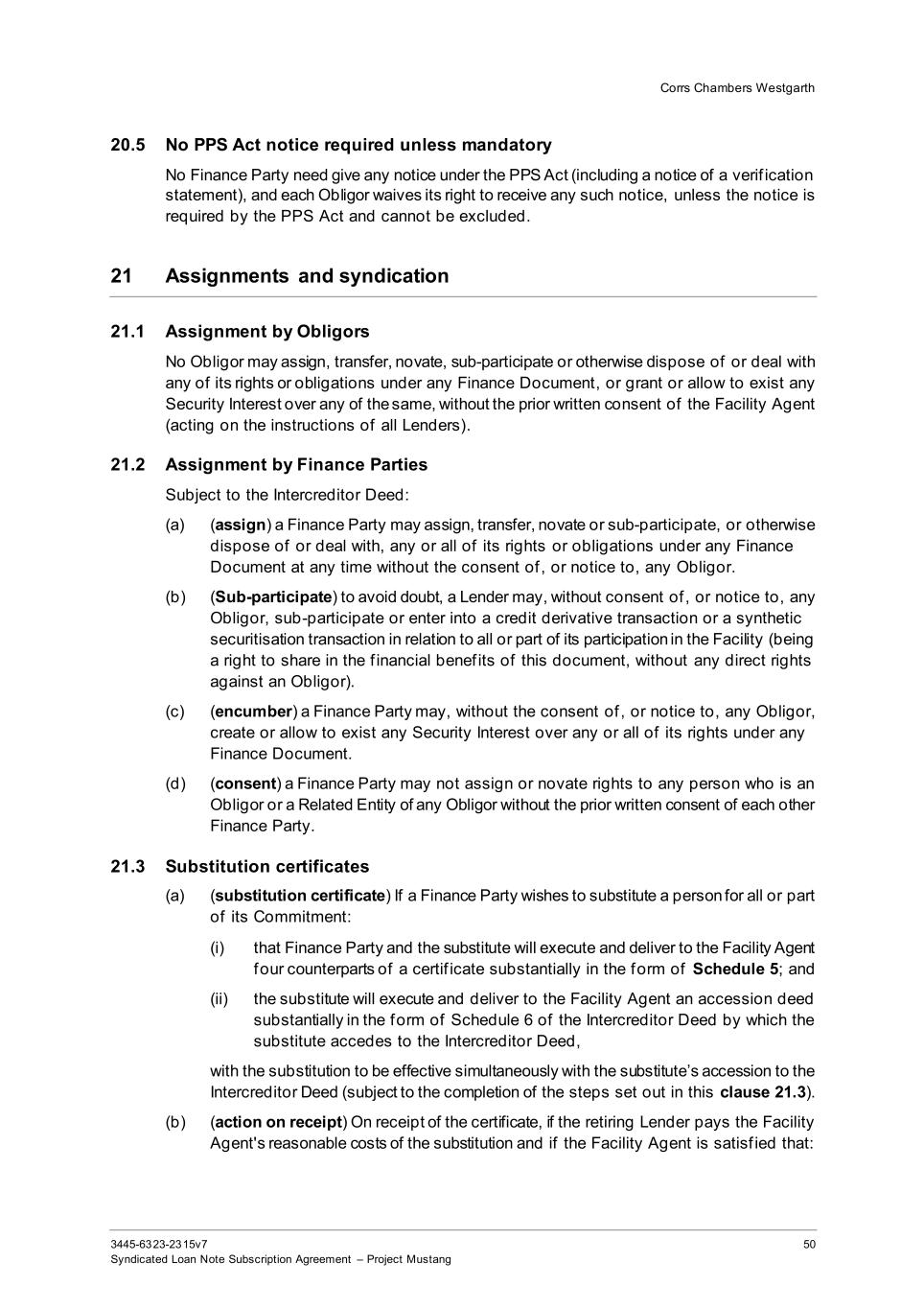 Corrs Chambers Westgarth 3445-6323-2315v7 50 Syndicated Loan Note Subscription Agreement – Project Mustang 20.5 No PPS Act notice required unless mandatory No Finance Party need give any notice under the PPS Act (including a notice of a verif ication statement), and each Obligor waives its right to receive any such notice, unless the notice is required by the PPS Act and cannot be excluded. 21 Assignments and syndication 21.1 Assignment by Obligors No Obligor may assign, transfer, novate, sub-participate or otherwise dispose of or deal with any of its rights or obligations under any Finance Document, or grant or allow to exist any Security Interest over any of the same, without the prior written consent of the Facility Agent (acting on the instructions of all Lenders). 21.2 Assignment by Finance Parties Subject to the Intercreditor Deed: (a) (assign) a Finance Party may assign, transfer, novate or sub-participate, or otherwise dispose of or deal with, any or all of its rights or obligations under any Finance Document at any time without the consent of , or notice to, any Obligor. (b) (Sub-participate) to avoid doubt, a Lender may, without consent of , or notice to, any Obligor, sub-participate or enter into a credit derivative transaction or a synthetic securitisation transaction in relation to all or part of its participation in the Facility (being a right to share in the f inancial benef its of this document, without any direct rights against an Obligor). (c) (encumber) a Finance Party may, without the consent of , or notice to, any Obligor, create or allow to exist any Security Interest over any or all of its rights under any Finance Document. (d) (consent) a Finance Party may not assign or novate rights to any person who is an Obligor or a Related Entity of any Obligor without the prior written consent of each other Finance Party. 21.3 Substitution certificates (a) (substitution certificate) If a Finance Party wishes to substitute a person for all or part of its Commitment: (i) that Finance Party and the substitute will execute and deliver to the Facility Agent four counterparts of a certif icate substantially in the form of Schedule 5; and (ii) the substitute will execute and deliver to the Facility Agent an accession deed substantially in the form of Schedule 6 of the Intercreditor Deed by which the substitute accedes to the Intercreditor Deed, with the substitution to be effective simultaneously with the substitute’s accession to the Intercreditor Deed (subject to the completion of the steps set out in this clause 21.3). (b) (action on receipt) On receipt of the certificate, if the retiring Lender pays the Facility Agent's reasonable costs of the substitution and if the Facility Agent is satisf ied that: