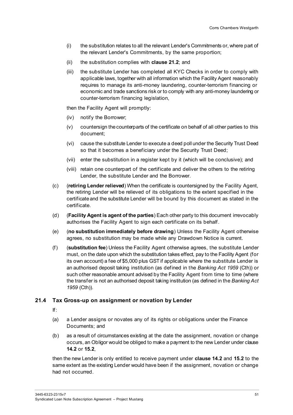 Corrs Chambers Westgarth 3445-6323-2315v7 51 Syndicated Loan Note Subscription Agreement – Project Mustang (i) the substitution relates to all the relevant Lender's Commitments or, where part of the relevant Lender's Commitments, by the same proportion; (ii) the substitution complies with clause 21.2; and (iii) the substitute Lender has completed all KYC Checks in order to comply with applicable laws, together with all information which the Facility Agent reasonably requires to manage its anti-money laundering, counter-terrorism f inancing or economic and trade sanctions risk or to comply with any anti-money laundering or counter-terrorism f inancing legislation, then the Facility Agent will promptly: (iv) notify the Borrower; (v) countersign the counterparts of the certificate on behalf of all other parties to this document; (vi) cause the substitute Lender to execute a deed poll under the Security Trust Deed so that it becomes a benef iciary under the Security Trust Deed; (vii) enter the substitution in a register kept by it (which will be conclusive); and (viii) retain one counterpart of the certif icate and deliver the others to the retiring Lender, the substitute Lender and the Borrower. (c) (retiring Lender relieved) When the certificate is countersigned by the Facility Agent, the retiring Lender will be relieved of its obligations to the extent specif ied in the certif icate and the substitute Lender will be bound by this document as stated in the certif icate. (d) (Facility Agent is agent of the parties) Each other party to this document irrevocably authorises the Facility Agent to sign each certif icate on its behalf . (e) (no substitution immediately before drawing) Unless the Facility Agent otherwise agrees, no substitution may be made while any Drawdown Notice is current. (f ) (substitution fee) Unless the Facility Agent otherwise agrees, the substitute Lender must, on the date upon which the substitution takes effect, pay to the Facility Agent (for its own account) a fee of $5,000 plus GST if applicable where the substitute Lender is an authorised deposit taking institution (as def ined in the Banking Act 1959 (Cth)) or such other reasonable amount advised by the Facility Agent f rom time to time (where the transfer is not an authorised deposit taking institution (as defined in the Banking Act 1959 (Cth)). 21.4 Tax Gross-up on assignment or novation by Lender If : (a) a Lender assigns or novates any of its rights or obligations under the Finance Documents; and (b) as a result of circumstances existing at the date the assignment, novation or change occurs, an Obligor would be obliged to make a payment to the new Lender under clause 14.2 or 15.2, then the new Lender is only entitled to receive payment under clause 14.2 and 15.2 to the same extent as the existing Lender would have been if the assignment, novation or change had not occurred.