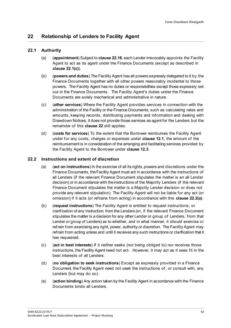 Corrs Chambers Westgarth 3445-6323-2315v7 52 Syndicated Loan Note Subscription Agreement – Project Mustang 22 Relationship of Lenders to Facility Agent 22.1 Authority (a) (appointment) Subject to clause 22.16, each Lender irrevocably appoints the Facility Agent to act as its agent under the Finance Documents (except as described in clause 22.1(c)). (b) (powers and duties) The Facility Agent has all powers expressly delegated to it by the Finance Documents together with all other powers reasonably incidental to those powers. The Facility Agent has no duties or responsibilities except those expressly set out in the Finance Documents. The Facility Agent's duties under the Finance Documents are solely mechanical and administrative in nature. (c) (other services) Where the Facility Agent provides services in connection with the administration of the Facility or the Finance Documents, such as calculating rates and amounts, keeping records, distributing payments and information and dealing with Drawdown Notices, it does not provide those services as agent for the Lenders but the remainder of this clause 22 still applies. (d) (costs for services) To the extent that the Borrower reimburses the Facility Agent under for any costs, charges or expenses under clause 12.1, the amount of the reimbursement is in consideration of the arranging and facilitating services provided by the Facility Agent to the Borrower under clause 12.3. 22.2 Instructions and extent of discretion (a) (act on instructions) In the exercise of all its rights, powers and discretions under the Finance Documents, the Facility Agent must act in accordance with the instructions of all Lenders (if the relevant Finance Document stipulates the matter is an all Lender decision) or in accordance with the instructions of the Majority Lenders (if the relevant Finance Document stipulates the matter is a Majority Lender decision or does not provide any relevant stipulation). The Facility Agent will not be liable for any act (or omission) if it acts (or ref rains f rom acting) in accordance with this clause 22.2(a). (b) (request instructions) The Facility Agent is entitled to request instructions, or clarif ication of any instruction, from the Lenders (or, if the relevant Finance Document stipulates the matter is a decision for any other Lender or group of Lenders, f rom that Lender or group of Lenders) as to whether, and in what manner, it should exercise or ref rain f rom exercising any right, power, authority or discretion. The Facility Agent may ref rain f rom acting unless and until it receives any such instructions or clarification that it has requested. (c) (act in best interests) If it neither seeks (not being obliged to) nor receives those instructions, the Facility Agent need not act. However, it may act as it sees f it in the best interests of all Lenders. (d) (no obligation to seek instructions) Except as expressly provided in a Finance Document, the Facility Agent need not seek the instructions of , or consult with, any Lenders (but may do so). (e) (action binding) Any action taken by the Facility Agent in accordance with the Finance Documents binds all Lenders.