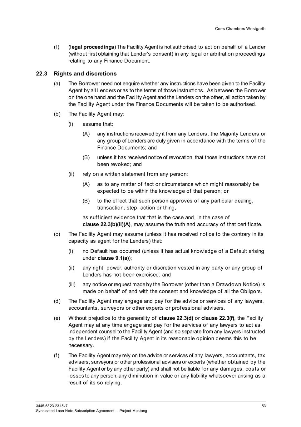 Corrs Chambers Westgarth 3445-6323-2315v7 53 Syndicated Loan Note Subscription Agreement – Project Mustang (f ) (legal proceedings) The Facility Agent is not authorised to act on behalf of a Lender (without f irst obtaining that Lender's consent) in any legal or arbitration proceedings relating to any Finance Document. 22.3 Rights and discretions (a) The Borrower need not enquire whether any instructions have been given to the Facility Agent by all Lenders or as to the terms of those instructions. As between the Borrower on the one hand and the Facility Agent and the Lenders on the other, all action taken by the Facility Agent under the Finance Documents will be taken to be authorised. (b) The Facility Agent may: (i) assume that: (A) any instructions received by it from any Lenders, the Majority Lenders or any group of Lenders are duly given in accordance with the terms of the Finance Documents; and (B) unless it has received notice of revocation, that those instructions have not been revoked; and (ii) rely on a written statement f rom any person: (A) as to any matter of fact or circumstance which might reasonably be expected to be within the knowledge of that person; or (B) to the ef fect that such person approves of any particular dealing, transaction, step, action or thing, as suf f icient evidence that that is the case and, in the case of clause 22.3(b)(ii)(A), may assume the truth and accuracy of that certif icate. (c) The Facility Agent may assume (unless it has received notice to the contrary in its capacity as agent for the Lenders) that: (i) no Default has occurred (unless it has actual knowledge of a Default arising under clause 9.1(a)); (ii) any right, power, authority or discretion vested in any party or any group of Lenders has not been exercised; and (iii) any notice or request made by the Borrower (other than a Drawdown Notice) is made on behalf of and with the consent and knowledge of all the Obligors. (d) The Facility Agent may engage and pay for the advice or services of any lawyers, accountants, surveyors or other experts or professional advisers. (e) Without prejudice to the generality of clause 22.3(d) or clause 22.3(f), the Facility Agent may at any time engage and pay for the services of any lawyers to act as independent counsel to the Facility Agent (and so separate from any lawyers instructed by the Lenders) if the Facility Agent in its reasonable opinion deems this to be necessary. (f ) The Facility Agent may rely on the advice or services of any lawyers, accountants, tax advisers, surveyors or other professional advisers or experts (whether obtained by the Facility Agent or by any other party) and shall not be liable for any damages, cos ts or losses to any person, any diminution in value or any liability whatsoever arising as a result of its so relying.