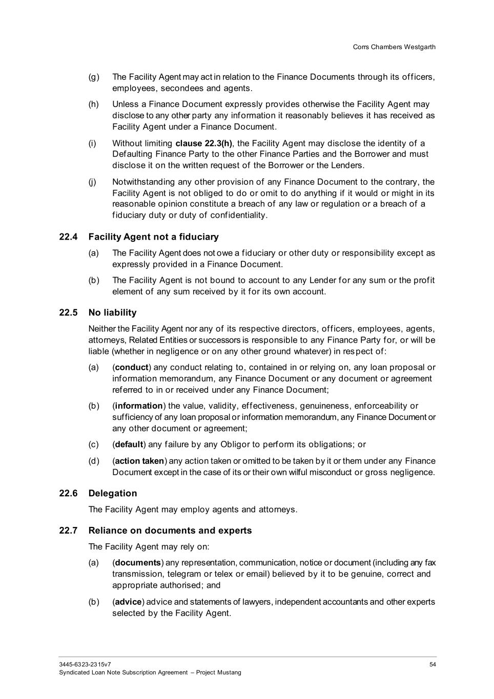 Corrs Chambers Westgarth 3445-6323-2315v7 54 Syndicated Loan Note Subscription Agreement – Project Mustang (g) The Facility Agent may act in relation to the Finance Documents through its of f icers, employees, secondees and agents. (h) Unless a Finance Document expressly provides otherwise the Facility Agent may disclose to any other party any information it reasonably believes it has received as Facility Agent under a Finance Document. (i) Without limiting clause 22.3(h), the Facility Agent may disclose the identity of a Defaulting Finance Party to the other Finance Parties and the Borrower and must disclose it on the written request of the Borrower or the Lenders. (j) Notwithstanding any other provision of any Finance Document to the contrary, the Facility Agent is not obliged to do or omit to do anything if it would or might in its reasonable opinion constitute a breach of any law or regulation or a breach of a f iduciary duty or duty of conf identiality. 22.4 Facility Agent not a fiduciary (a) The Facility Agent does not owe a f iduciary or other duty or responsibility except as expressly provided in a Finance Document. (b) The Facility Agent is not bound to account to any Lender for any sum or the prof it element of any sum received by it for its own account. 22.5 No liability Neither the Facility Agent nor any of its respective directors, of f icers, employees, agents, attorneys, Related Entities or successors is responsible to any Finance Party for, or will be liable (whether in negligence or on any other ground whatever) in respect of : (a) (conduct) any conduct relating to, contained in or relying on, any loan proposal or information memorandum, any Finance Document or any document or agreement referred to in or received under any Finance Document; (b) (information) the value, validity, ef fectiveness, genuineness, enforceability or suf ficiency of any loan proposal or information memorandum, any Finance Document or any other document or agreement; (c) (default) any failure by any Obligor to perform its obligations; or (d) (action taken) any action taken or omitted to be taken by it or them under any Finance Document except in the case of its or their own wilful misconduct or gross negligence. 22.6 Delegation The Facility Agent may employ agents and attorneys. 22.7 Reliance on documents and experts The Facility Agent may rely on: (a) (documents) any representation, communication, notice or document (including any fax transmission, telegram or telex or email) believed by it to be genuine, correct and appropriate authorised; and (b) (advice) advice and statements of lawyers, independent accountants and other experts selected by the Facility Agent.
