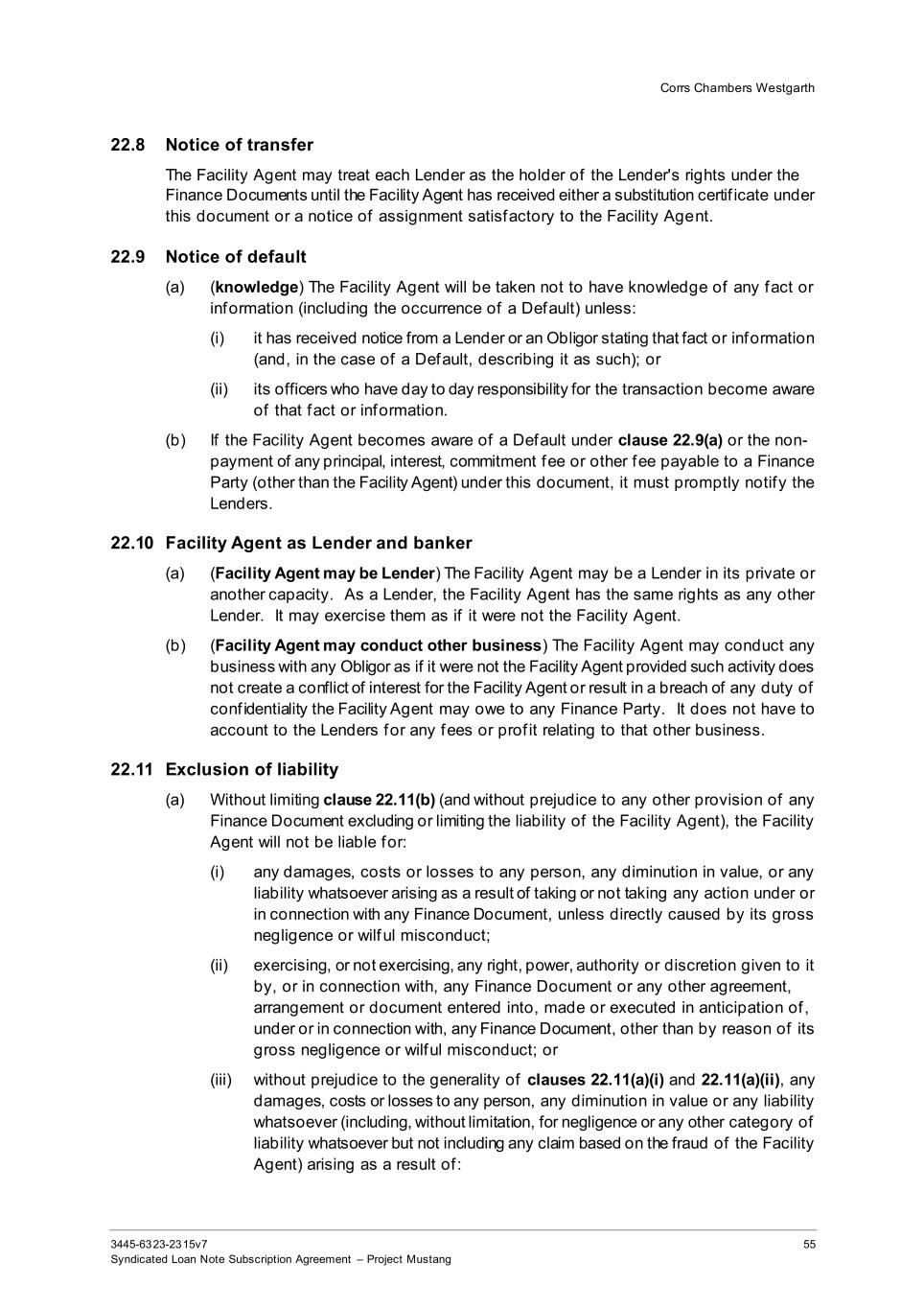 Corrs Chambers Westgarth 3445-6323-2315v7 55 Syndicated Loan Note Subscription Agreement – Project Mustang 22.8 Notice of transfer The Facility Agent may treat each Lender as the holder of the Lender's rights under the Finance Documents until the Facility Agent has received either a substitution certif icate under this document or a notice of assignment satisfactory to the Facility Agent. 22.9 Notice of default (a) (knowledge) The Facility Agent will be taken not to have knowledge of any fact or information (including the occurrence of a Default) unless: (i) it has received notice from a Lender or an Obligor stating that fact or information (and, in the case of a Default, describing it as such); or (ii) its officers who have day to day responsibility for the transaction become aware of that fact or information. (b) If the Facility Agent becomes aware of a Default under clause 22.9(a) or the non- payment of any principal, interest, commitment fee or other fee payable to a Finance Party (other than the Facility Agent) under this document, it must promptly notify the Lenders. 22.10 Facility Agent as Lender and banker (a) (Facility Agent may be Lender) The Facility Agent may be a Lender in its private or another capacity. As a Lender, the Facility Agent has the same rights as any other Lender. It may exercise them as if it were not the Facility Agent. (b) (Facility Agent may conduct other business) The Facility Agent may conduct any business with any Obligor as if it were not the Facility Agent provided such activity does not create a conflict of interest for the Facility Agent or result in a breach of any duty of conf identiality the Facility Agent may owe to any Finance Party. It does not have to account to the Lenders for any fees or prof it relating to that other business. 22.11 Exclusion of liability (a) Without limiting clause 22.11(b) (and without prejudice to any other provision of any Finance Document excluding or limiting the liability of the Facility Agent), the Facility Agent will not be liable for: (i) any damages, costs or losses to any person, any diminution in value, or any liability whatsoever arising as a result of taking or not taking any action under or in connection with any Finance Document, unless directly caused by its gross negligence or wilf ul misconduct; (ii) exercising, or not exercising, any right, power, authority or discretion given to it by, or in connection with, any Finance Document or any other agreement, arrangement or document entered into, made or executed in anticipation of , under or in connection with, any Finance Document, other than by reason of its gross negligence or wilful misconduct; or (iii) without prejudice to the generality of clauses 22.11(a)(i) and 22.11(a)(ii), any damages, costs or losses to any person, any diminution in value or any liability whatsoever (including, without limitation, for negligence or any other category of liability whatsoever but not including any claim based on the fraud of the Facility Agent) arising as a result of :