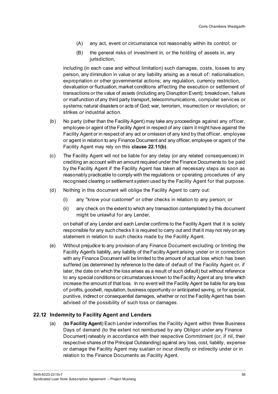 Corrs Chambers Westgarth 3445-6323-2315v7 56 Syndicated Loan Note Subscription Agreement – Project Mustang (A) any act, event or circumstance not reasonably within its control; or (B) the general risks of investment in, or the holding of assets in, any jurisdiction, including (in each case and without limitation) such damages, costs, losses to any person, any diminution in value or any liability arising as a result of : nationalisation, expropriation or other governmental actions; any regulation, currency restriction, devaluation or fluctuation; market conditions af fecting the execution or settlement of transactions or the value of assets (including any Disruption Event); breakdown, failure or malfunction of any third party transport, telecommunications, computer services or systems; natural disasters or acts of God; war, terrorism, insurrection or revolution; or strikes or industrial action. (b) No party (other than the Facility Agent) may take any proceedings against any of f icer, employee or agent of the Facility Agent in respect of any claim it might have against the Facility Agent or in respect of any act or omission of any kind by that off icer, employee or agent in relation to any Finance Document and any officer, employee or agent of the Facility Agent may rely on this clause 22.11(b). (c) The Facility Agent will not be liable for any delay (or any related consequences) in crediting an account with an amount required under the Finance Documents to be paid by the Facility Agent if the Facility Agent has taken all necessary steps as soon as reasonably practicable to comply with the regulations or operating procedures of any recognised clearing or settlement system used by the Facility Agent for that purpose. (d) Nothing in this document will oblige the Facility Agent to carry out: (i) any "know your customer" or other checks in relation to any person; or (ii) any check on the extent to which any transaction contemplated by this document might be unlawful for any Lender, on behalf of any Lender and each Lender confirms to the Facility Agent that it is solely responsible for any such checks it is required to carry out and that it may not rely on any statement in relation to such checks made by the Facility Agent. (e) Without prejudice to any provision of any Finance Document excluding or limiting the Facility Agent's liability, any liability of the Facility Agent arising under or in connection with any Finance Document will be limited to the amount of actual loss which has been suf fered (as determined by reference to the date of default of the Facility Agent or, if later, the date on which the loss arises as a result of such default) but without reference to any special conditions or circumstances known to the Facility Agent at any time which increase the amount of that loss. In no event will the Facility Agent be liable for any loss of profits, goodwill, reputation, business opportunity or anticipated saving, or for special, punitive, indirect or consequential damages, whether or not the Facility Agent has been advised of the possibility of such loss or damages. 22.12 Indemnity to Facility Agent and Lenders (a) (to Facility Agent) Each Lender indemnif ies the Facility Agent within three Business Days of demand (to the extent not reimbursed by any Obligor under any Finance Document) rateably in accordance with their respective Commitment (or, if nil, their respective shares of the Principal Outstanding) against any loss, cost, liability, expense or damage the Facility Agent may sustain or incur directly or indirectly under or in relation to the Finance Documents as Facility Agent.