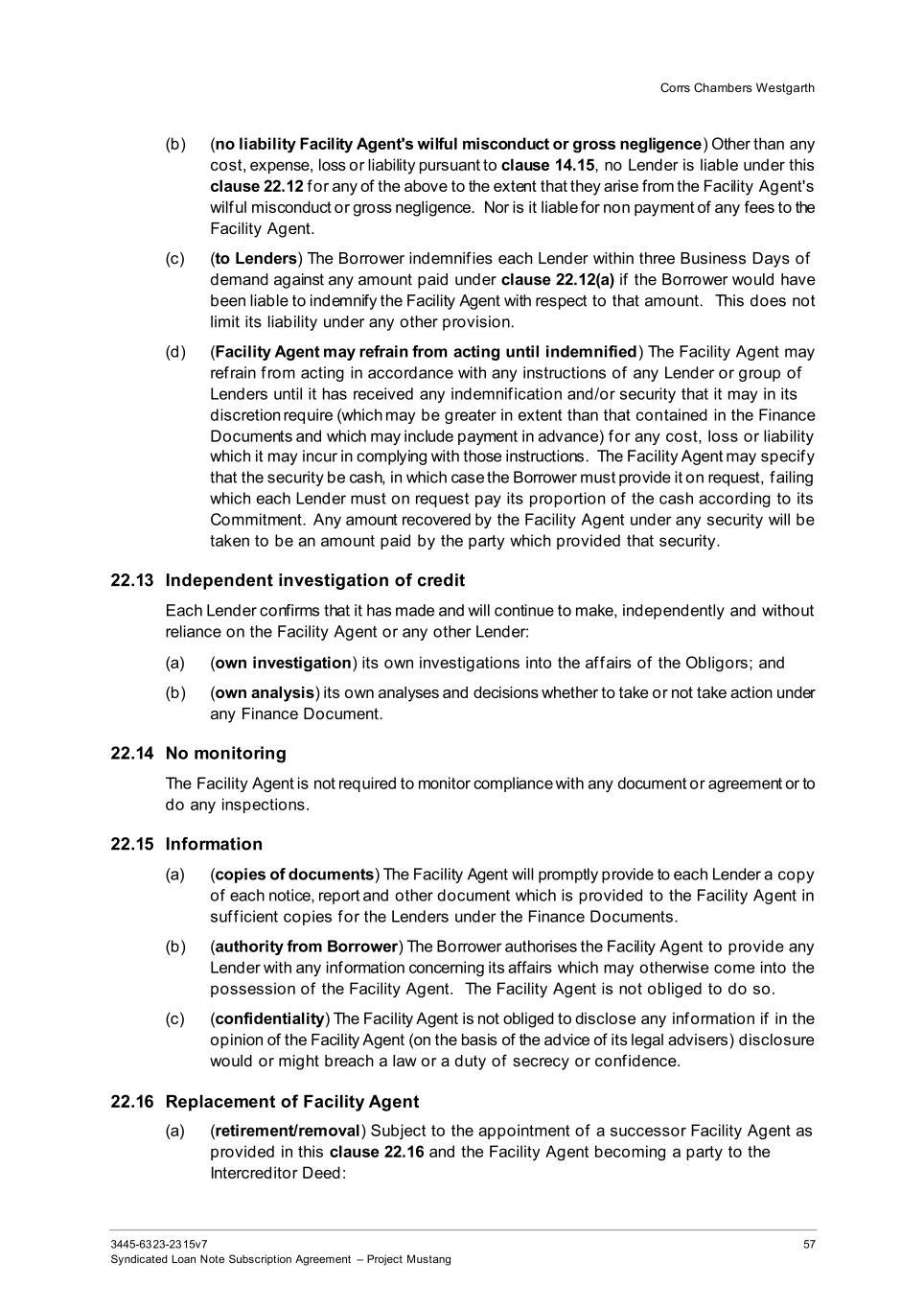 Corrs Chambers Westgarth 3445-6323-2315v7 57 Syndicated Loan Note Subscription Agreement – Project Mustang (b) (no liability Facility Agent's wilful misconduct or gross negligence) Other than any cost, expense, loss or liability pursuant to clause 14.15, no Lender is liable under this clause 22.12 for any of the above to the extent that they arise from the Facility Agent's wilful misconduct or gross negligence. Nor is it liable for non payment of any fees to the Facility Agent. (c) (to Lenders) The Borrower indemnif ies each Lender within three Business Days of demand against any amount paid under clause 22.12(a) if the Borrower would have been liable to indemnify the Facility Agent with respect to that amount. This does not limit its liability under any other provision. (d) (Facility Agent may refrain from acting until indemnified) The Facility Agent may ref rain f rom acting in accordance with any instructions of any Lender or group of Lenders until it has received any indemnif ication and/or security that it may in its discretion require (which may be greater in extent than that contained in the Finance Documents and which may include payment in advance) for any cost, loss or liability which it may incur in complying with those instructions. The Facility Agent may specify that the security be cash, in which case the Borrower must provide it on request, failing which each Lender must on request pay its proportion of the cash according to its Commitment. Any amount recovered by the Facility Agent under any security will be taken to be an amount paid by the party which provided that security. 22.13 Independent investigation of credit Each Lender confirms that it has made and will continue to make, independently and without reliance on the Facility Agent or any other Lender: (a) (own investigation) its own investigations into the af fairs of the Obligors; and (b) (own analysis) its own analyses and decisions whether to take or not take action under any Finance Document. 22.14 No monitoring The Facility Agent is not required to monitor compliance with any document or agreement or to do any inspections. 22.15 Information (a) (copies of documents) The Facility Agent will promptly provide to each Lender a copy of each notice, report and other document which is provided to the Facility Agent in suf f icient copies for the Lenders under the Finance Documents. (b) (authority from Borrower) The Borrower authorises the Facility Agent to provide any Lender with any information concerning its affairs which may otherwise come into the possession of the Facility Agent. The Facility Agent is not obliged to do so. (c) (confidentiality) The Facility Agent is not obliged to disclose any information if in the opinion of the Facility Agent (on the basis of the advice of its legal advisers) disclosure would or might breach a law or a duty of secrecy or conf idence. 22.16 Replacement of Facility Agent (a) (retirement/removal) Subject to the appointment of a successor Facility Agent as provided in this clause 22.16 and the Facility Agent becoming a party to the Intercreditor Deed: