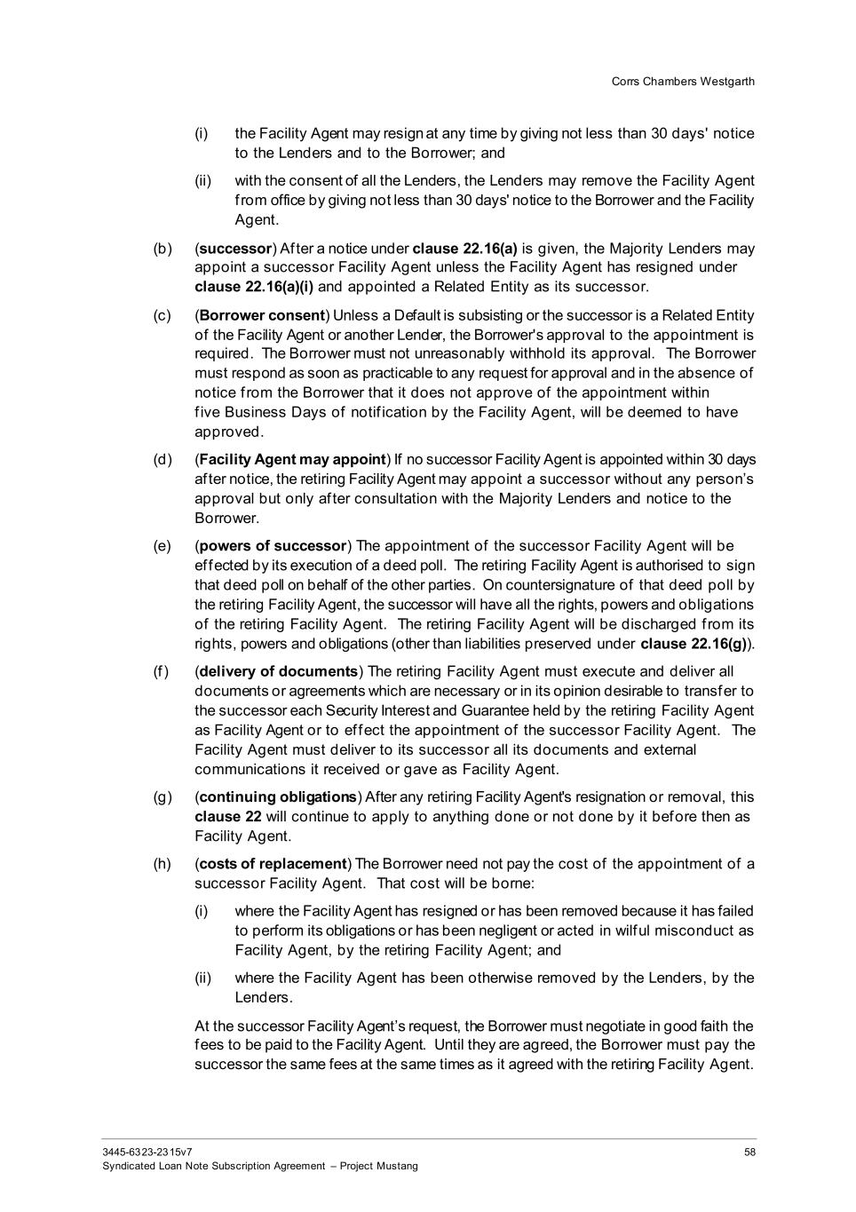Corrs Chambers Westgarth 3445-6323-2315v7 58 Syndicated Loan Note Subscription Agreement – Project Mustang (i) the Facility Agent may resign at any time by giving not less than 30 days' notice to the Lenders and to the Borrower; and (ii) with the consent of all the Lenders, the Lenders may remove the Facility Agent f rom office by giving not less than 30 days' notice to the Borrower and the Facility Agent. (b) (successor) Af ter a notice under clause 22.16(a) is given, the Majority Lenders may appoint a successor Facility Agent unless the Facility Agent has resigned under clause 22.16(a)(i) and appointed a Related Entity as its successor. (c) (Borrower consent) Unless a Default is subsisting or the successor is a Related Entity of the Facility Agent or another Lender, the Borrower's approval to the appointment is required. The Borrower must not unreasonably withhold its approval. The Borrower must respond as soon as practicable to any request for approval and in the absence of notice f rom the Borrower that it does not approve of the appointment within f ive Business Days of notif ication by the Facility Agent, will be deemed to have approved. (d) (Facility Agent may appoint) If no successor Facility Agent is appointed within 30 days af ter notice, the retiring Facility Agent may appoint a successor without any person’s approval but only af ter consultation with the Majority Lenders and notice to the Borrower. (e) (powers of successor) The appointment of the successor Facility Agent will be ef fected by its execution of a deed poll. The retiring Facility Agent is authorised to sign that deed poll on behalf of the other parties. On countersignature of that deed poll by the retiring Facility Agent, the successor will have all the rights, powers and obligations of the retiring Facility Agent. The retiring Facility Agent will be discharged f rom its rights, powers and obligations (other than liabilities preserved under clause 22.16(g)). (f ) (delivery of documents) The retiring Facility Agent must execute and deliver all documents or agreements which are necessary or in its opinion desirable to transfer to the successor each Security Interest and Guarantee held by the retiring Facility Agent as Facility Agent or to ef fect the appointment of the successor Facility Agent. The Facility Agent must deliver to its successor all its documents and external communications it received or gave as Facility Agent. (g) (continuing obligations) After any retiring Facility Agent's resignation or removal, this clause 22 will continue to apply to anything done or not done by it before then as Facility Agent. (h) (costs of replacement) The Borrower need not pay the cost of the appointment of a successor Facility Agent. That cost will be borne: (i) where the Facility Agent has resigned or has been removed because it has failed to perform its obligations or has been negligent or acted in wilful misconduct as Facility Agent, by the retiring Facility Agent; and (ii) where the Facility Agent has been otherwise removed by the Lenders, by the Lenders. At the successor Facility Agent’s request, the Borrower must negotiate in good faith the fees to be paid to the Facility Agent. Until they are agreed, the Borrower must pay the successor the same fees at the same times as it agreed with the retiring Facility Agent.