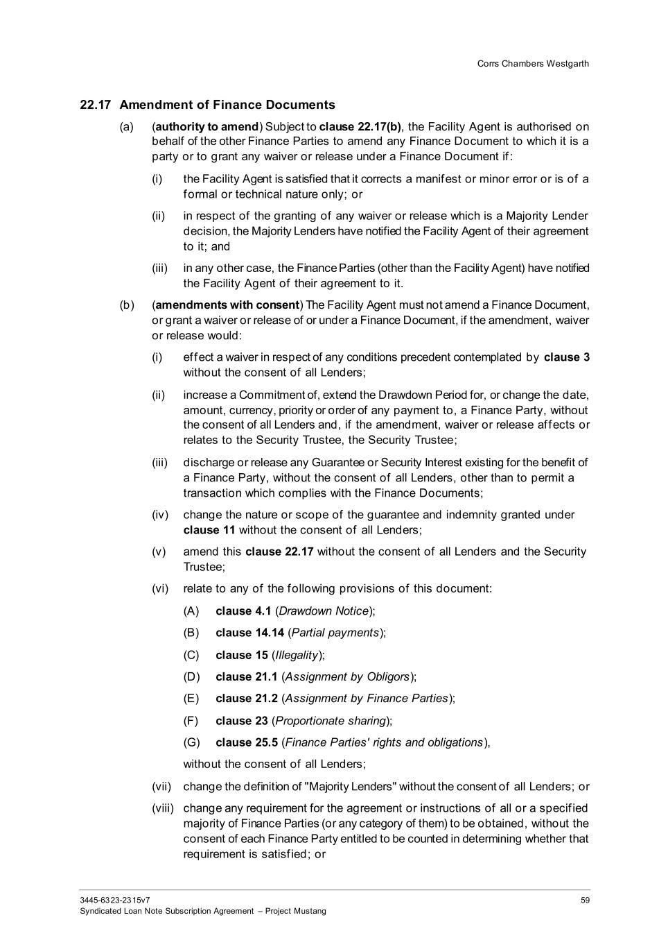 Corrs Chambers Westgarth 3445-6323-2315v7 59 Syndicated Loan Note Subscription Agreement – Project Mustang 22.17 Amendment of Finance Documents (a) (authority to amend) Subject to clause 22.17(b), the Facility Agent is authorised on behalf of the other Finance Parties to amend any Finance Document to which it is a party or to grant any waiver or release under a Finance Document if : (i) the Facility Agent is satisfied that it corrects a manifest or minor error or is of a formal or technical nature only; or (ii) in respect of the granting of any waiver or release which is a Majority Lender decision, the Majority Lenders have notified the Facility Agent of their agreement to it; and (iii) in any other case, the Finance Parties (other than the Facility Agent) have notified the Facility Agent of their agreement to it. (b) (amendments with consent) The Facility Agent must not amend a Finance Document, or grant a waiver or release of or under a Finance Document, if the amendment, waiver or release would: (i) ef fect a waiver in respect of any conditions precedent contemplated by clause 3 without the consent of all Lenders; (ii) increase a Commitment of, extend the Drawdown Period for, or change the date, amount, currency, priority or order of any payment to, a Finance Party, without the consent of all Lenders and, if the amendment, waiver or release af fects or relates to the Security Trustee, the Security Trustee; (iii) discharge or release any Guarantee or Security Interest existing for the benefit of a Finance Party, without the consent of all Lenders, other than to permit a transaction which complies with the Finance Documents; (iv) change the nature or scope of the guarantee and indemnity granted under clause 11 without the consent of all Lenders; (v) amend this clause 22.17 without the consent of all Lenders and the Security Trustee; (vi) relate to any of the following provisions of this document: (A) clause 4.1 (Drawdown Notice); (B) clause 14.14 (Partial payments); (C) clause 15 (Illegality); (D) clause 21.1 (Assignment by Obligors); (E) clause 21.2 (Assignment by Finance Parties); (F) clause 23 (Proportionate sharing); (G) clause 25.5 (Finance Parties' rights and obligations), without the consent of all Lenders; (vii) change the definition of "Majority Lenders" without the consent of all Lenders; or (viii) change any requirement for the agreement or instructions of all or a specif ied majority of Finance Parties (or any category of them) to be obtained, without the consent of each Finance Party entitled to be counted in determining whether that requirement is satisf ied; or