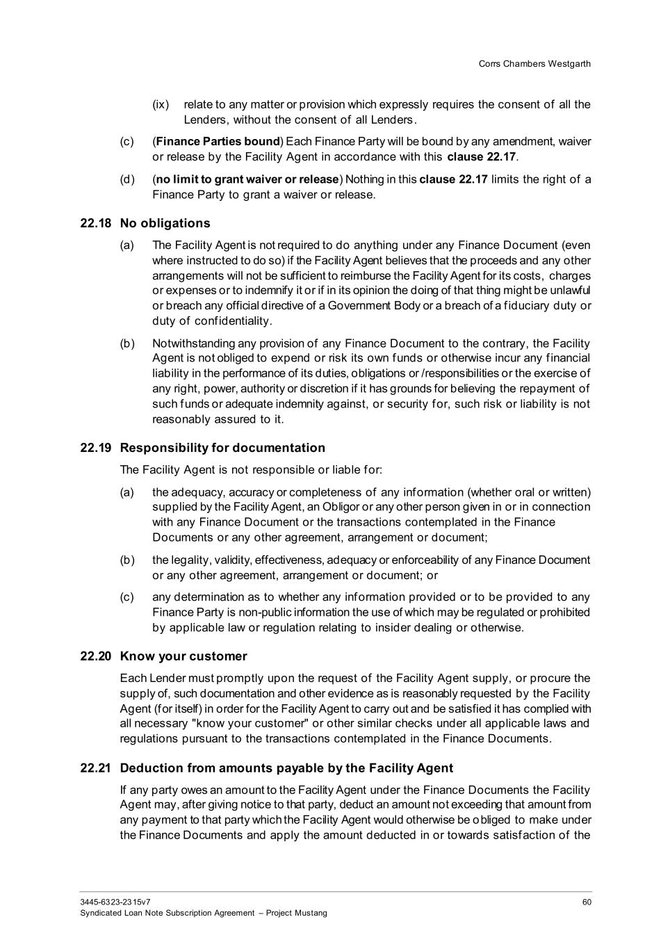 Corrs Chambers Westgarth 3445-6323-2315v7 60 Syndicated Loan Note Subscription Agreement – Project Mustang (ix) relate to any matter or provision which expressly requires the consent of all the Lenders, without the consent of all Lenders. (c) (Finance Parties bound) Each Finance Party will be bound by any amendment, waiver or release by the Facility Agent in accordance with this clause 22.17. (d) (no limit to grant waiver or release) Nothing in this clause 22.17 limits the right of a Finance Party to grant a waiver or release. 22.18 No obligations (a) The Facility Agent is not required to do anything under any Finance Document (even where instructed to do so) if the Facility Agent believes that the proceeds and any other arrangements will not be sufficient to reimburse the Facility Agent for its costs, charges or expenses or to indemnify it or if in its opinion the doing of that thing might be unlawful or breach any official directive of a Government Body or a breach of a f iduciary duty or duty of conf identiality. (b) Notwithstanding any provision of any Finance Document to the contrary, the Facility Agent is not obliged to expend or risk its own funds or otherwise incur any f inancial liability in the performance of its duties, obligations or /responsibilities or the exercise of any right, power, authority or discretion if it has grounds for believing the repayment of such funds or adequate indemnity against, or security for, such risk or liability is not reasonably assured to it. 22.19 Responsibility for documentation The Facility Agent is not responsible or liable for: (a) the adequacy, accuracy or completeness of any information (whether oral or written) supplied by the Facility Agent, an Obligor or any other person given in or in connection with any Finance Document or the transactions contemplated in the Finance Documents or any other agreement, arrangement or document; (b) the legality, validity, effectiveness, adequacy or enforceability of any Finance Document or any other agreement, arrangement or document; or (c) any determination as to whether any information provided or to be provided to any Finance Party is non-public information the use of which may be regulated or prohibited by applicable law or regulation relating to insider dealing or otherwise. 22.20 Know your customer Each Lender must promptly upon the request of the Facility Agent supply, or procure the supply of, such documentation and other evidence as is reasonably requested by the Facility Agent (for itself) in order for the Facility Agent to carry out and be satisfied it has complied with all necessary "know your customer" or other similar checks under all applicable laws and regulations pursuant to the transactions contemplated in the Finance Documents. 22.21 Deduction from amounts payable by the Facility Agent If any party owes an amount to the Facility Agent under the Finance Documents the Facility Agent may, after giving notice to that party, deduct an amount not exceeding that amount from any payment to that party which the Facility Agent would otherwise be obliged to make under the Finance Documents and apply the amount deducted in or towards satisfaction of the