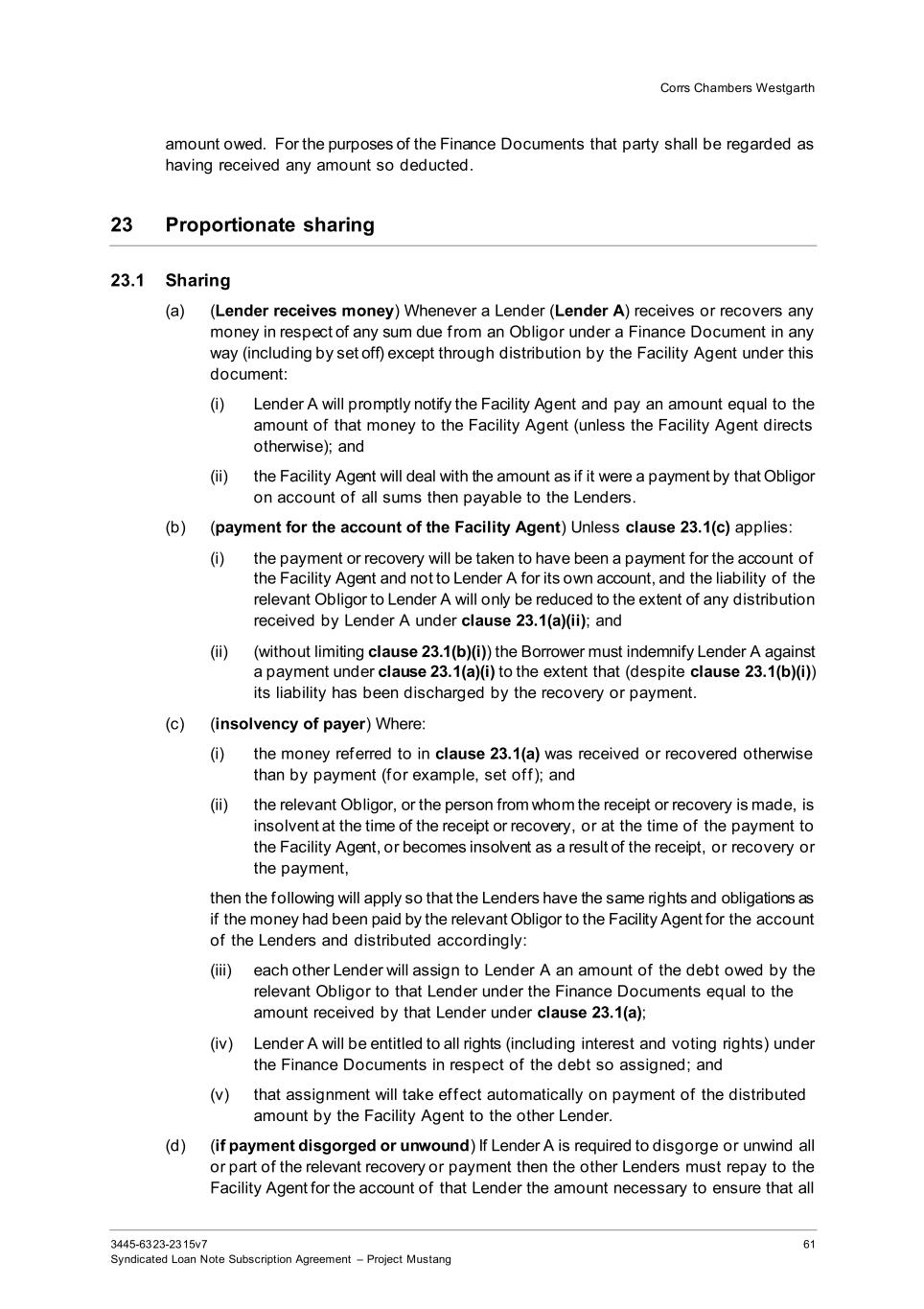 Corrs Chambers Westgarth 3445-6323-2315v7 61 Syndicated Loan Note Subscription Agreement – Project Mustang amount owed. For the purposes of the Finance Documents that party shall be regarded as having received any amount so deducted. 23 Proportionate sharing 23.1 Sharing (a) (Lender receives money) Whenever a Lender (Lender A) receives or recovers any money in respect of any sum due f rom an Obligor under a Finance Document in any way (including by set off) except through distribution by the Facility Agent under this document: (i) Lender A will promptly notify the Facility Agent and pay an amount equal to the amount of that money to the Facility Agent (unless the Facility Agent directs otherwise); and (ii) the Facility Agent will deal with the amount as if it were a payment by that Obligor on account of all sums then payable to the Lenders. (b) (payment for the account of the Facility Agent) Unless clause 23.1(c) applies: (i) the payment or recovery will be taken to have been a payment for the account of the Facility Agent and not to Lender A for its own account, and the liability of the relevant Obligor to Lender A will only be reduced to the extent of any distribution received by Lender A under clause 23.1(a)(ii); and (ii) (without limiting clause 23.1(b)(i)) the Borrower must indemnify Lender A against a payment under clause 23.1(a)(i) to the extent that (despite clause 23.1(b)(i)) its liability has been discharged by the recovery or payment. (c) (insolvency of payer) Where: (i) the money referred to in clause 23.1(a) was received or recovered otherwise than by payment (for example, set of f ); and (ii) the relevant Obligor, or the person from whom the receipt or recovery is made, is insolvent at the time of the receipt or recovery, or at the time of the payment to the Facility Agent, or becomes insolvent as a result of the receipt, or recovery or the payment, then the following will apply so that the Lenders have the same rights and obligations as if the money had been paid by the relevant Obligor to the Facility Agent for the account of the Lenders and distributed accordingly: (iii) each other Lender will assign to Lender A an amount of the debt owed by the relevant Obligor to that Lender under the Finance Documents equal to the amount received by that Lender under clause 23.1(a); (iv) Lender A will be entitled to all rights (including interest and voting rights) under the Finance Documents in respect of the debt so assigned; and (v) that assignment will take ef fect automatically on payment of the distributed amount by the Facility Agent to the other Lender. (d) (if payment disgorged or unwound) If Lender A is required to disgorge or unwind all or part of the relevant recovery or payment then the other Lenders must repay to the Facility Agent for the account of that Lender the amount necessary to ensure that all