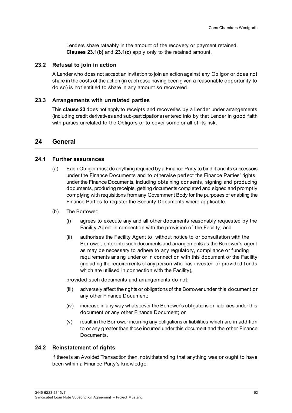 Corrs Chambers Westgarth 3445-6323-2315v7 62 Syndicated Loan Note Subscription Agreement – Project Mustang Lenders share rateably in the amount of the recovery or payment retained. Clauses 23.1(b) and 23.1(c) apply only to the retained amount. 23.2 Refusal to join in action A Lender who does not accept an invitation to join an action against any Obligor or does not share in the costs of the action (in each case having been given a reasonable opportunity to do so) is not entitled to share in any amount so recovered. 23.3 Arrangements with unrelated parties This clause 23 does not apply to receipts and recoveries by a Lender under arrangements (including credit derivatives and sub-participations) entered into by that Lender in good faith with parties unrelated to the Obligors or to cover some or all of its risk. 24 General 24.1 Further assurances (a) Each Obligor must do anything required by a Finance Party to bind it and its successors under the Finance Documents and to otherwise perfect the Finance Parties' rights under the Finance Documents, including obtaining consents, signing and producing documents, producing receipts, getting documents completed and signed and promptly complying with requisitions from any Government Body for the purposes of enabling the Finance Parties to register the Security Documents where applicable. (b) The Borrower: (i) agrees to execute any and all other documents reasonably requested by the Facility Agent in connection with the provision of the Facility; and (ii) authorises the Facility Agent to, without notice to or consultation with the Borrower, enter into such documents and arrangements as the Borrower’s agent as may be necessary to adhere to any regulatory, compliance or funding requirements arising under or in connection with this document or the Facility (including the requirements of any person who has invested or provided funds which are utilised in connection with the Facility), provided such documents and arrangements do not: (iii) adversely affect the rights or obligations of the Borrower under this document or any other Finance Document; (iv) increase in any way whatsoever the Borrower’s obligations or liabilities under this document or any other Finance Document; or (v) result in the Borrower incurring any obligations or liabilities which are in addition to or any greater than those incurred under this document and the other Finance Documents. 24.2 Reinstatement of rights If there is an Avoided Transaction then, notwithstanding that anything was or ought to have been within a Finance Party's knowledge: