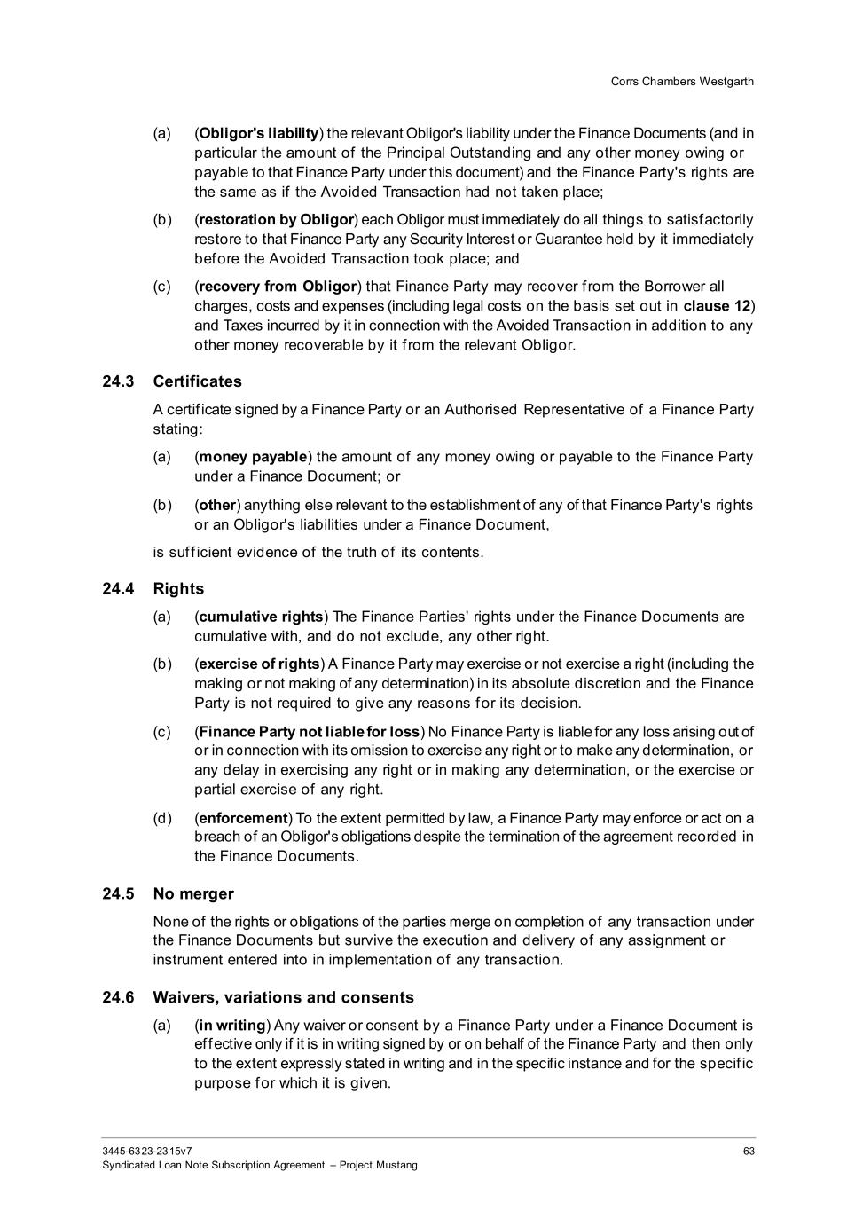 Corrs Chambers Westgarth 3445-6323-2315v7 63 Syndicated Loan Note Subscription Agreement – Project Mustang (a) (Obligor's liability) the relevant Obligor's liability under the Finance Documents (and in particular the amount of the Principal Outstanding and any other money owing or payable to that Finance Party under this document) and the Finance Party's rights are the same as if the Avoided Transaction had not taken place; (b) (restoration by Obligor) each Obligor must immediately do all things to satisfactorily restore to that Finance Party any Security Interest or Guarantee held by it immediately before the Avoided Transaction took place; and (c) (recovery from Obligor) that Finance Party may recover f rom the Borrower all charges, costs and expenses (including legal costs on the basis set out in clause 12) and Taxes incurred by it in connection with the Avoided Transaction in addition to any other money recoverable by it f rom the relevant Obligor. 24.3 Certificates A certif icate signed by a Finance Party or an Authorised Representative of a Finance Party stating: (a) (money payable) the amount of any money owing or payable to the Finance Party under a Finance Document; or (b) (other) anything else relevant to the establishment of any of that Finance Party's rights or an Obligor's liabilities under a Finance Document, is suf f icient evidence of the truth of its contents. 24.4 Rights (a) (cumulative rights) The Finance Parties' rights under the Finance Documents are cumulative with, and do not exclude, any other right. (b) (exercise of rights) A Finance Party may exercise or not exercise a right (including the making or not making of any determination) in its absolute discretion and the Finance Party is not required to give any reasons for its decision. (c) (Finance Party not liable for loss) No Finance Party is liable for any loss arising out of or in connection with its omission to exercise any right or to make any determination, or any delay in exercising any right or in making any determination, or the exercise or partial exercise of any right. (d) (enforcement) To the extent permitted by law, a Finance Party may enforce or act on a breach of an Obligor's obligations despite the termination of the agreement recorded in the Finance Documents. 24.5 No merger None of the rights or obligations of the parties merge on completion of any transaction under the Finance Documents but survive the execution and delivery of any assignment or instrument entered into in implementation of any transaction. 24.6 Waivers, variations and consents (a) (in writing) Any waiver or consent by a Finance Party under a Finance Document is ef fective only if it is in writing signed by or on behalf of the Finance Party and then only to the extent expressly stated in writing and in the specific instance and for the specif ic purpose for which it is given.