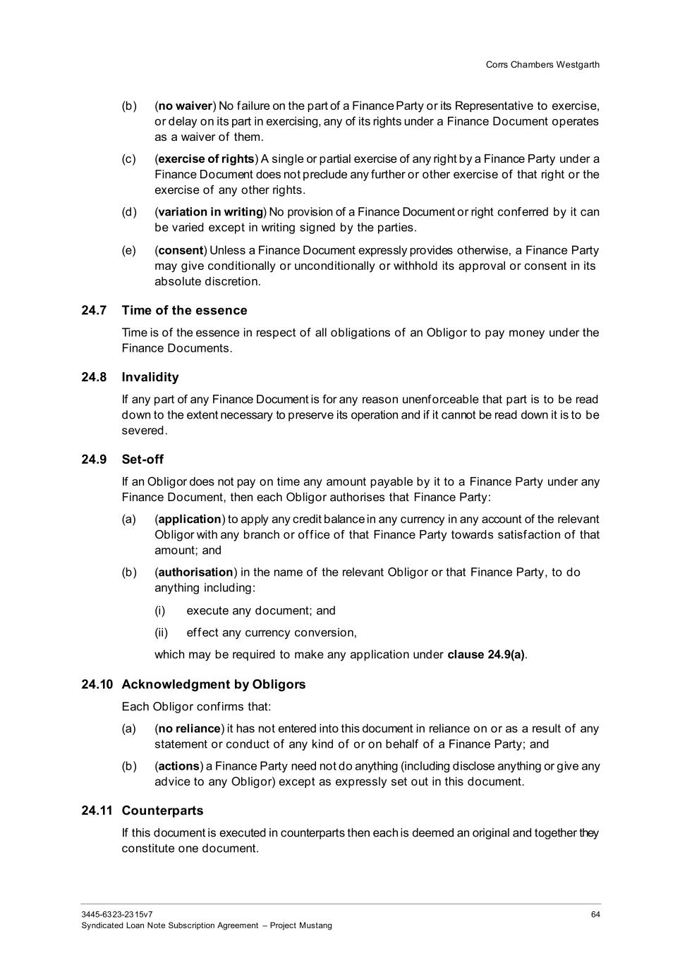 Corrs Chambers Westgarth 3445-6323-2315v7 64 Syndicated Loan Note Subscription Agreement – Project Mustang (b) (no waiver) No failure on the part of a Finance Party or its Representative to exercise, or delay on its part in exercising, any of its rights under a Finance Document operates as a waiver of them. (c) (exercise of rights) A single or partial exercise of any right by a Finance Party under a Finance Document does not preclude any further or other exercise of that right or the exercise of any other rights. (d) (variation in writing) No provision of a Finance Document or right conferred by it can be varied except in writing signed by the parties. (e) (consent) Unless a Finance Document expressly provides otherwise, a Finance Party may give conditionally or unconditionally or withhold its approval or consent in its absolute discretion. 24.7 Time of the essence Time is of the essence in respect of all obligations of an Obligor to pay money under the Finance Documents. 24.8 Invalidity If any part of any Finance Document is for any reason unenforceable that part is to be read down to the extent necessary to preserve its operation and if it cannot be read down it is to be severed. 24.9 Set-off If an Obligor does not pay on time any amount payable by it to a Finance Party under any Finance Document, then each Obligor authorises that Finance Party: (a) (application) to apply any credit balance in any currency in any account of the relevant Obligor with any branch or of f ice of that Finance Party towards satisfaction of that amount; and (b) (authorisation) in the name of the relevant Obligor or that Finance Party, to do anything including: (i) execute any document; and (ii) ef fect any currency conversion, which may be required to make any application under clause 24.9(a). 24.10 Acknowledgment by Obligors Each Obligor conf irms that: (a) (no reliance) it has not entered into this document in reliance on or as a result of any statement or conduct of any kind of or on behalf of a Finance Party; and (b) (actions) a Finance Party need not do anything (including disclose anything or give any advice to any Obligor) except as expressly set out in this document. 24.11 Counterparts If this document is executed in counterparts then each is deemed an original and together they constitute one document.