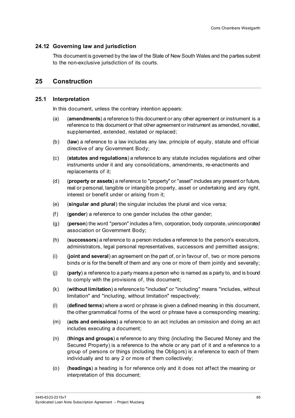 Corrs Chambers Westgarth 3445-6323-2315v7 65 Syndicated Loan Note Subscription Agreement – Project Mustang 24.12 Governing law and jurisdiction This document is governed by the law of the State of New South Wales and the parties submit to the non-exclusive jurisdiction of its courts. 25 Construction 25.1 Interpretation In this document, unless the contrary intention appears: (a) (amendments) a reference to this document or any other agreement or instrument is a reference to this document or that other agreement or instrument as amended, novated, supplemented, extended, restated or replaced; (b) (law) a reference to a law includes any law, principle of equity, statute and of f icial directive of any Government Body; (c) (statutes and regulations) a reference to any statute includes regulations and other instruments under it and any consolidations, amendments, re-enactments and replacements of it; (d) (property or assets) a reference to "property" or "asset" includes any present or future, real or personal, tangible or intangible property, asset or undertaking and any right, interest or benef it under or arising f rom it; (e) (singular and plural) the singular includes the plural and vice versa; (f ) (gender) a reference to one gender includes the other gender; (g) (person) the word "person" includes a f irm, corporation, body corporate, unincorporated association or Government Body; (h) (successors) a reference to a person includes a reference to the person's executors, administrators, legal personal representatives, successors and permitted assigns; (i) (joint and several) an agreement on the part of, or in favour of , two or more persons binds or is for the benefit of them and any one or more of them jointly and severally; (j) (party) a reference to a party means a person who is named as a party to, and is bound to comply with the provisions of , this document; (k) (without limitation) a reference to "includes" or "including" means "includes, without limitation" and "including, without limitation" respectively; (l) (defined terms) where a word or phrase is given a defined meaning in this document, the other grammatical forms of the word or phrase have a corresponding meaning; (m) (acts and omissions) a reference to an act includes an omission and doing an act includes executing a document; (n) (things and groups) a reference to any thing (including the Secured Money and the Secured Property) is a reference to the whole or any part of it and a reference to a group of persons or things (including the Obligors) is a reference to each of them individually and to any 2 or more of them collectively; (o) (headings) a heading is for reference only and it does not af fect the meaning or interpretation of this document;