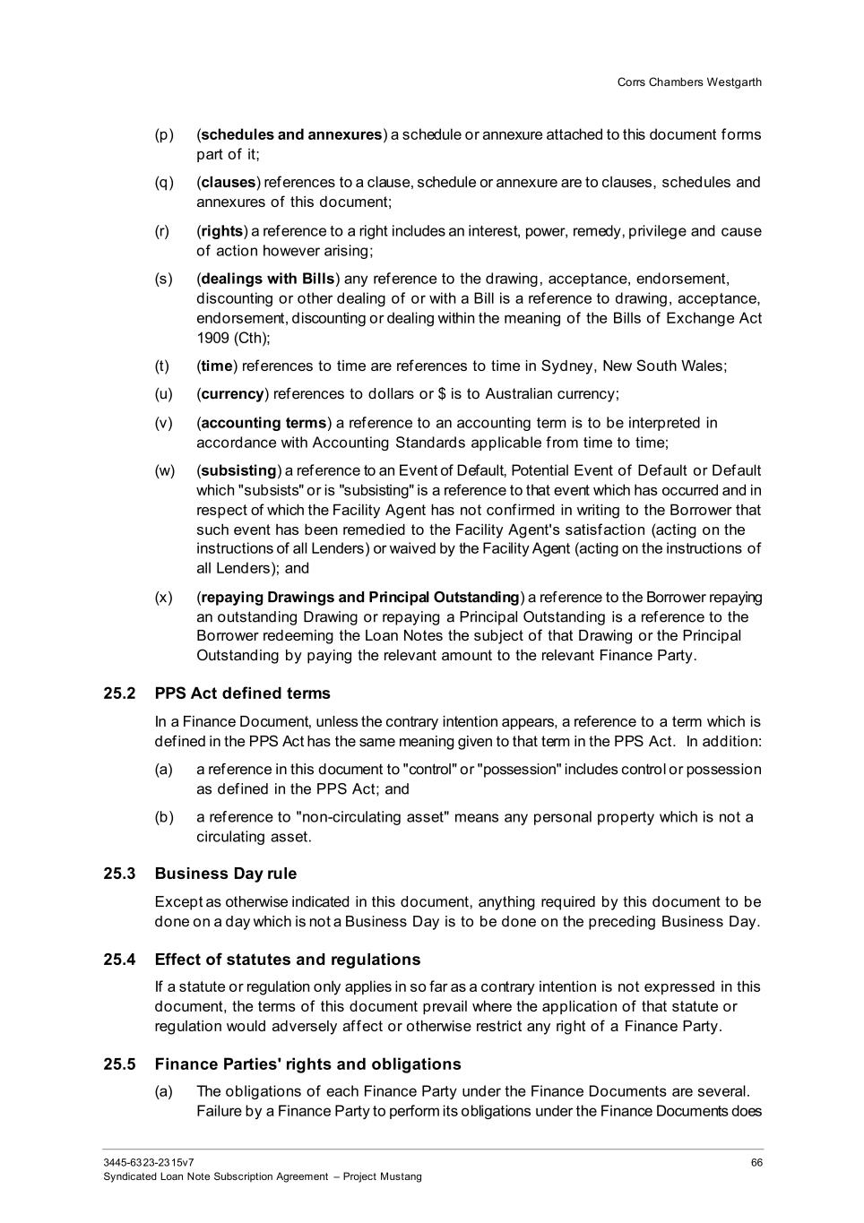 Corrs Chambers Westgarth 3445-6323-2315v7 66 Syndicated Loan Note Subscription Agreement – Project Mustang (p) (schedules and annexures) a schedule or annexure attached to this document forms part of it; (q) (clauses) references to a clause, schedule or annexure are to clauses, schedules and annexures of this document; (r) (rights) a reference to a right includes an interest, power, remedy, privilege and cause of action however arising; (s) (dealings with Bills) any reference to the drawing, acceptance, endorsement, discounting or other dealing of or with a Bill is a reference to drawing, acceptance, endorsement, discounting or dealing within the meaning of the Bills of Exchange Act 1909 (Cth); (t) (time) references to time are references to time in Sydney, New South Wales; (u) (currency) references to dollars or $ is to Australian currency; (v) (accounting terms) a reference to an accounting term is to be interpreted in accordance with Accounting Standards applicable f rom time to time; (w) (subsisting) a reference to an Event of Default, Potential Event of Default or Default which "subsists" or is "subsisting" is a reference to that event which has occurred and in respect of which the Facility Agent has not conf irmed in writing to the Borrower that such event has been remedied to the Facility Agent's satisfaction (acting on the instructions of all Lenders) or waived by the Facility Agent (acting on the instructions of all Lenders); and (x) (repaying Drawings and Principal Outstanding) a reference to the Borrower repaying an outstanding Drawing or repaying a Principal Outstanding is a reference to the Borrower redeeming the Loan Notes the subject of that Drawing or the Principal Outstanding by paying the relevant amount to the relevant Finance Party. 25.2 PPS Act defined terms In a Finance Document, unless the contrary intention appears, a reference to a term which is def ined in the PPS Act has the same meaning given to that term in the PPS Act. In addition: (a) a reference in this document to "control" or "possession" includes control or possession as def ined in the PPS Act; and (b) a reference to "non-circulating asset" means any personal property which is not a circulating asset. 25.3 Business Day rule Except as otherwise indicated in this document, anything required by this document to be done on a day which is not a Business Day is to be done on the preceding Business Day. 25.4 Effect of statutes and regulations If a statute or regulation only applies in so far as a contrary intention is not expressed in this document, the terms of this document prevail where the application of that statute or regulation would adversely af fect or otherwise restrict any right of a Finance Party. 25.5 Finance Parties' rights and obligations (a) The obligations of each Finance Party under the Finance Documents are several. Failure by a Finance Party to perform its obligations under the Finance Documents does