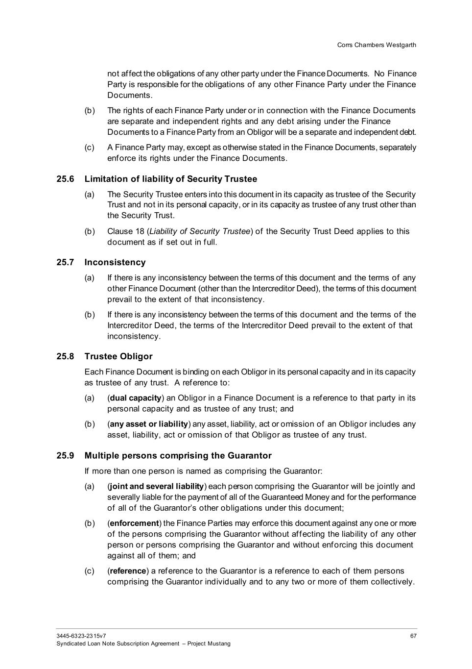 Corrs Chambers Westgarth 3445-6323-2315v7 67 Syndicated Loan Note Subscription Agreement – Project Mustang not af fect the obligations of any other party under the Finance Documents. No Finance Party is responsible for the obligations of any other Finance Party under the Finance Documents. (b) The rights of each Finance Party under or in connection with the Finance Documents are separate and independent rights and any debt arising under the Finance Documents to a Finance Party from an Obligor will be a separate and independent debt. (c) A Finance Party may, except as otherwise stated in the Finance Documents, separately enforce its rights under the Finance Documents. 25.6 Limitation of liability of Security Trustee (a) The Security Trustee enters into this document in its capacity as trustee of the Security Trust and not in its personal capacity, or in its capacity as trustee of any trust other than the Security Trust. (b) Clause 18 (Liability of Security Trustee) of the Security Trust Deed applies to this document as if set out in full. 25.7 Inconsistency (a) If there is any inconsistency between the terms of this document and the terms of any other Finance Document (other than the Intercreditor Deed), the terms of this document prevail to the extent of that inconsistency. (b) If there is any inconsistency between the terms of this document and the terms of the Intercreditor Deed, the terms of the Intercreditor Deed prevail to the extent of that inconsistency. 25.8 Trustee Obligor Each Finance Document is binding on each Obligor in its personal capacity and in its capacity as trustee of any trust. A reference to: (a) (dual capacity) an Obligor in a Finance Document is a reference to that party in its personal capacity and as trustee of any trust; and (b) (any asset or liability) any asset, liability, act or omission of an Obligor includes any asset, liability, act or omission of that Obligor as trustee of any trust. 25.9 Multiple persons comprising the Guarantor If more than one person is named as comprising the Guarantor: (a) (joint and several liability) each person comprising the Guarantor will be jointly and severally liable for the payment of all of the Guaranteed Money and for the performance of all of the Guarantor’s other obligations under this document; (b) (enforcement) the Finance Parties may enforce this document against any one or more of the persons comprising the Guarantor without af fecting the liability of any other person or persons comprising the Guarantor and without enforcing this document against all of them; and (c) (reference) a reference to the Guarantor is a reference to each of them persons comprising the Guarantor individually and to any two or more of them collectively.