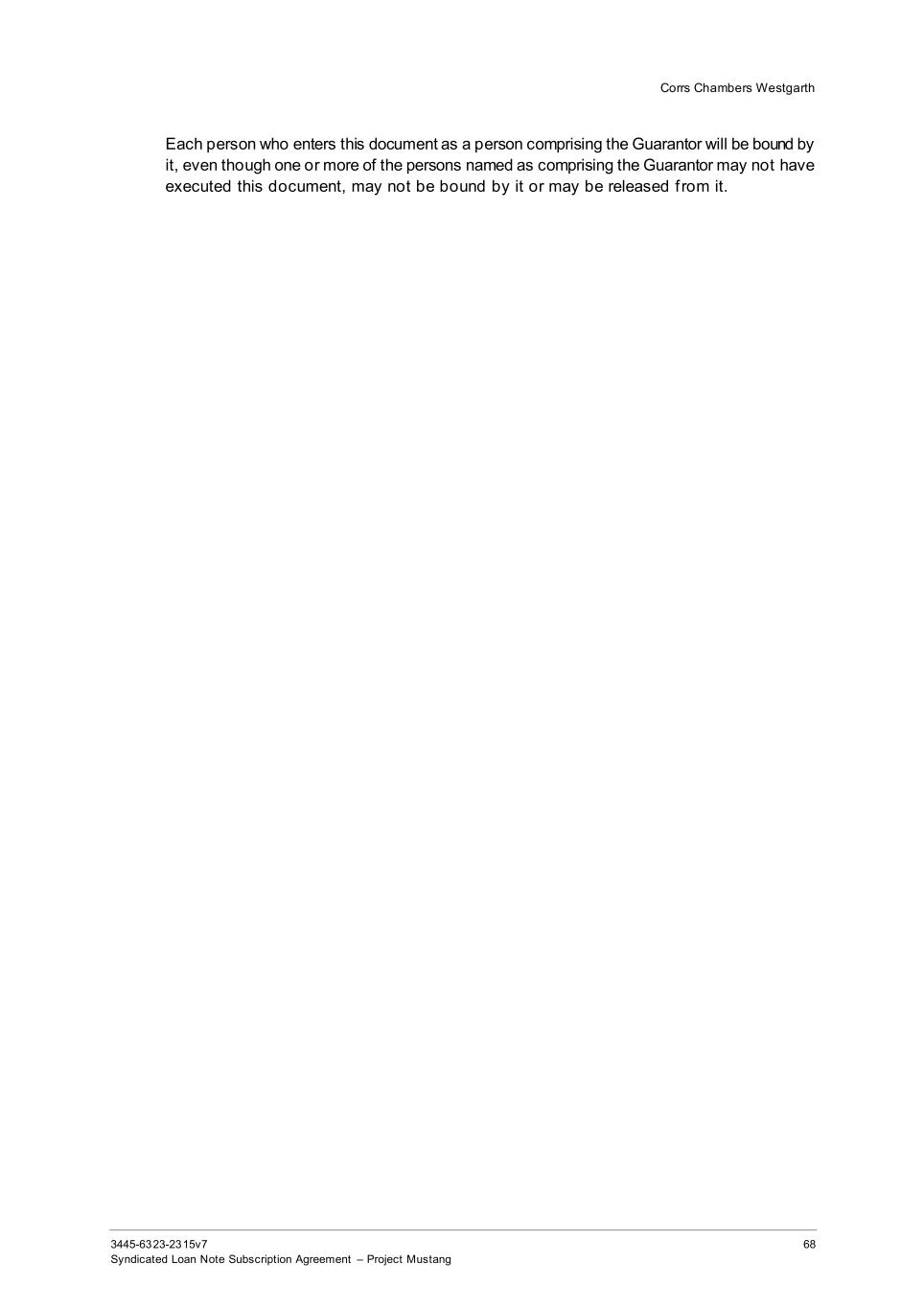 Corrs Chambers Westgarth 3445-6323-2315v7 68 Syndicated Loan Note Subscription Agreement – Project Mustang Each person who enters this document as a person comprising the Guarantor will be bound by it, even though one or more of the persons named as comprising the Guarantor may not have executed this document, may not be bound by it or may be released f rom it.