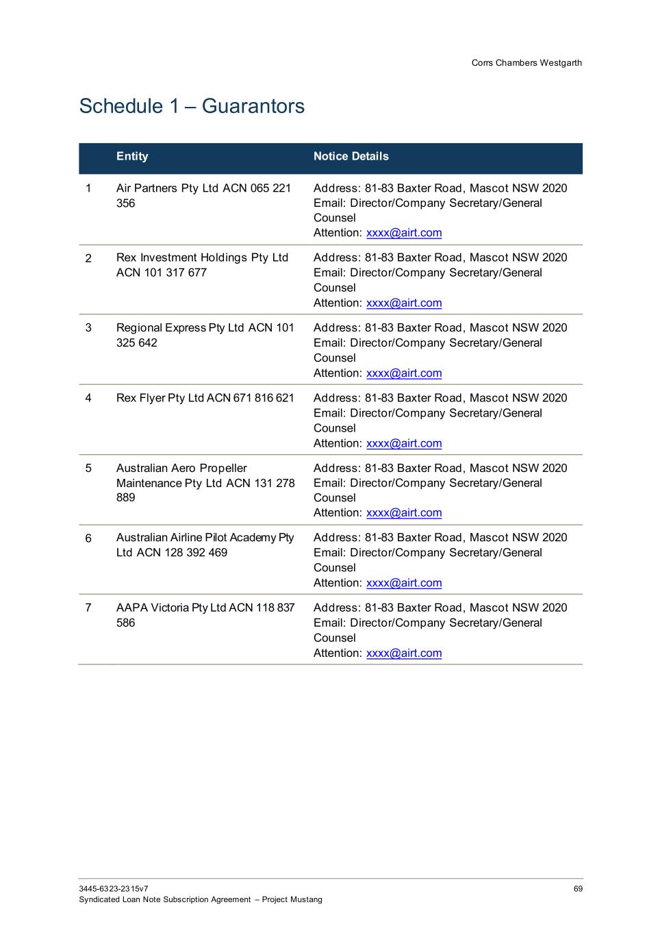 Corrs Chambers Westgarth 3445-6323-2315v7 69 Syndicated Loan Note Subscription Agreement – Project Mustang Schedule 1 – Guarantors Entity Notice Details 1 Air Partners Pty Ltd ACN 065 221 356 Address: 81-83 Baxter Road, Mascot NSW 2020 Email: Director/Company Secretary/General Counsel Attention: xxxx@airt.com 2 Rex Investment Holdings Pty Ltd ACN 101 317 677 Address: 81-83 Baxter Road, Mascot NSW 2020 Email: Director/Company Secretary/General Counsel Attention: xxxx@airt.com 3 Regional Express Pty Ltd ACN 101 325 642 Address: 81-83 Baxter Road, Mascot NSW 2020 Email: Director/Company Secretary/General Counsel Attention: xxxx@airt.com 4 Rex Flyer Pty Ltd ACN 671 816 621 Address: 81-83 Baxter Road, Mascot NSW 2020 Email: Director/Company Secretary/General Counsel Attention: xxxx@airt.com 5 Australian Aero Propeller Maintenance Pty Ltd ACN 131 278 889 Address: 81-83 Baxter Road, Mascot NSW 2020 Email: Director/Company Secretary/General Counsel Attention: xxxx@airt.com 6 Australian Airline Pilot Academy Pty Ltd ACN 128 392 469 Address: 81-83 Baxter Road, Mascot NSW 2020 Email: Director/Company Secretary/General Counsel Attention: xxxx@airt.com 7 AAPA Victoria Pty Ltd ACN 118 837 586 Address: 81-83 Baxter Road, Mascot NSW 2020 Email: Director/Company Secretary/General Counsel Attention: xxxx@airt.com