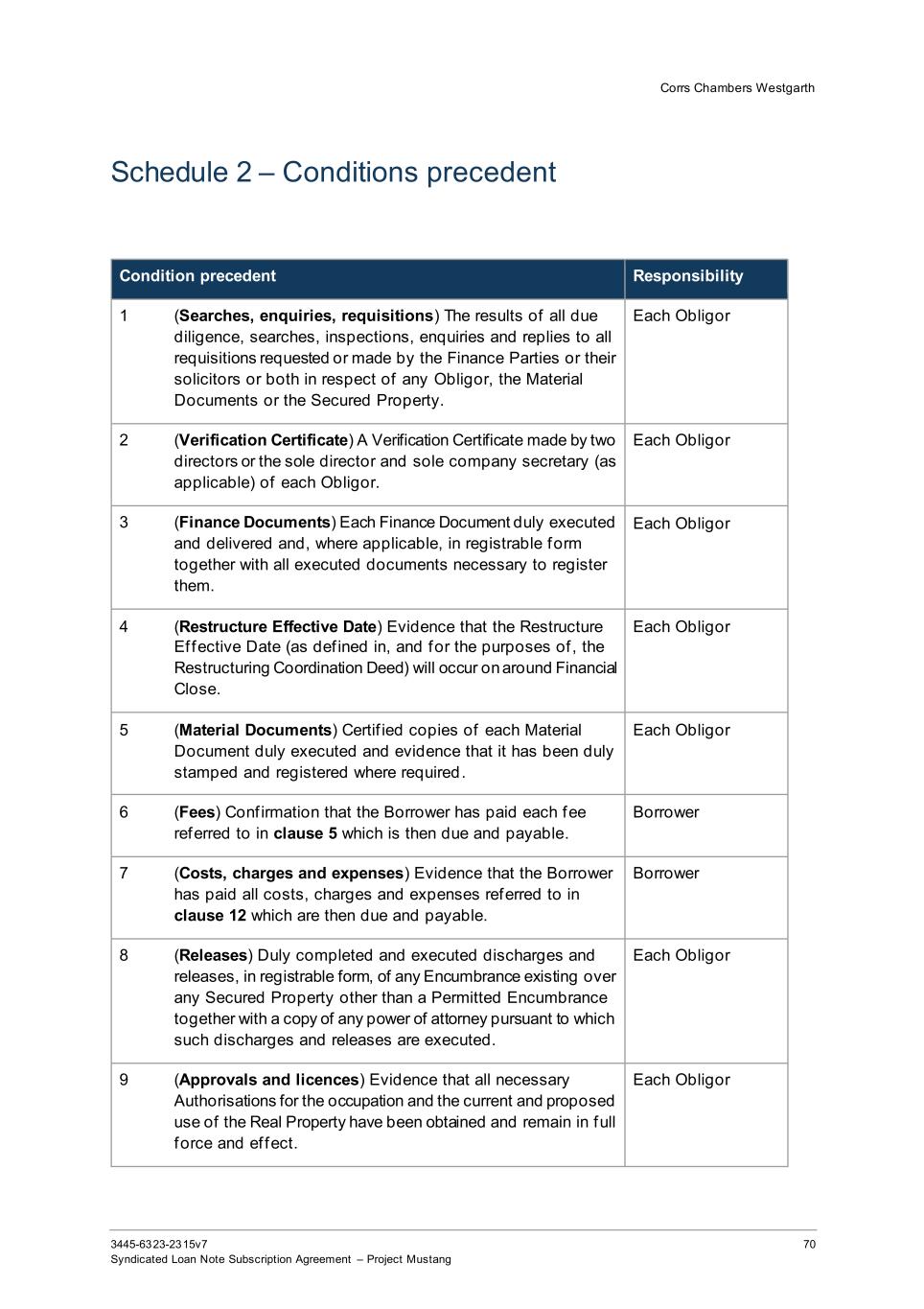 Corrs Chambers Westgarth 3445-6323-2315v7 70 Syndicated Loan Note Subscription Agreement – Project Mustang Schedule 2 – Conditions precedent Condition precedent Responsibility 1 (Searches, enquiries, requisitions) The results of all due diligence, searches, inspections, enquiries and replies to all requisitions requested or made by the Finance Parties or their solicitors or both in respect of any Obligor, the Material Documents or the Secured Property. Each Obligor 2 (Verification Certificate) A Verification Certificate made by two directors or the sole director and sole company secretary (as applicable) of each Obligor. Each Obligor 3 (Finance Documents) Each Finance Document duly executed and delivered and, where applicable, in registrable form together with all executed documents necessary to register them. Each Obligor 4 (Restructure Effective Date) Evidence that the Restructure Ef fective Date (as def ined in, and for the purposes of , the Restructuring Coordination Deed) will occur on around Financial Close. Each Obligor 5 (Material Documents) Certif ied copies of each Material Document duly executed and evidence that it has been duly stamped and registered where required. Each Obligor 6 (Fees) Conf irmation that the Borrower has paid each fee referred to in clause 5 which is then due and payable. Borrower 7 (Costs, charges and expenses) Evidence that the Borrower has paid all costs, charges and expenses referred to in clause 12 which are then due and payable. Borrower 8 (Releases) Duly completed and executed discharges and releases, in registrable form, of any Encumbrance existing over any Secured Property other than a Permitted Encumbrance together with a copy of any power of attorney pursuant to which such discharges and releases are executed. Each Obligor 9 (Approvals and licences) Evidence that all necessary Authorisations for the occupation and the current and proposed use of the Real Property have been obtained and remain in full force and ef fect. Each Obligor