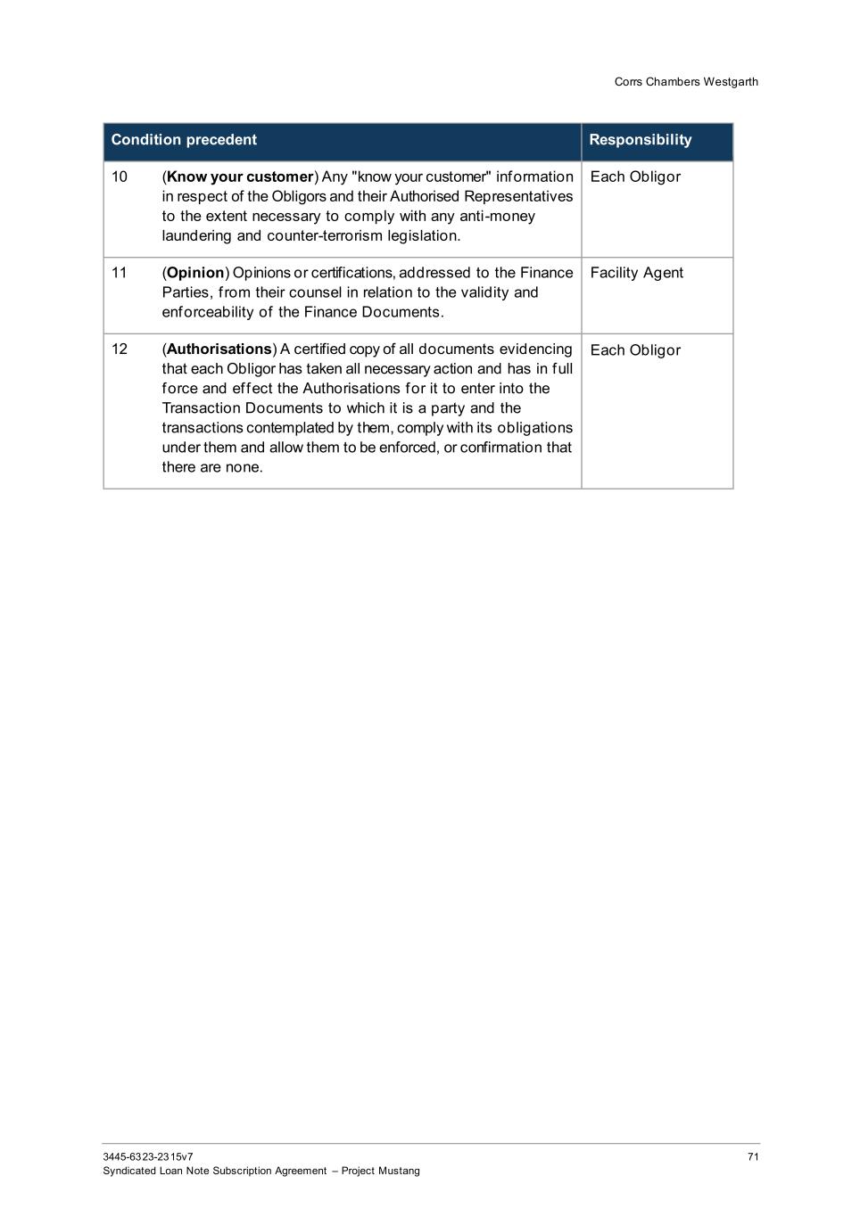 Corrs Chambers Westgarth 3445-6323-2315v7 71 Syndicated Loan Note Subscription Agreement – Project Mustang Condition precedent Responsibility 10 (Know your customer) Any "know your customer" information in respect of the Obligors and their Authorised Representatives to the extent necessary to comply with any anti-money laundering and counter-terrorism legislation. Each Obligor 11 (Opinion) Opinions or certifications, addressed to the Finance Parties, f rom their counsel in relation to the validity and enforceability of the Finance Documents. Facility Agent 12 (Authorisations) A certified copy of all documents evidencing that each Obligor has taken all necessary action and has in full force and ef fect the Authorisations for it to enter into the Transaction Documents to which it is a party and the transactions contemplated by them, comply with its obligations under them and allow them to be enforced, or confirmation that there are none. Each Obligor