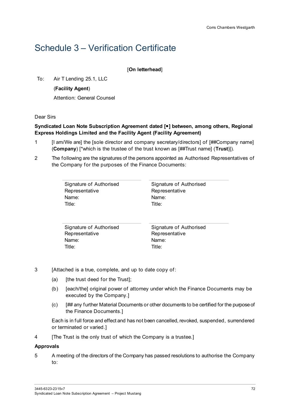 Corrs Chambers Westgarth 3445-6323-2315v7 72 Syndicated Loan Note Subscription Agreement – Project Mustang Schedule 3 – Verification Certificate [On letterhead] To: Air T Lending 25.1, LLC (Facility Agent) Attention: General Counsel Dear Sirs Syndicated Loan Note Subscription Agreement dated [] between, among others, Regional Express Holdings Limited and the Facility Agent (Facility Agreement) 1 [I am/We are] the [sole director and company secretary/directors] of [##Company name] (Company) [*which is the trustee of the trust known as [##Trust name] (Trust)]). 2 The following are the signatures of the persons appointed as Authorised Representatives of the Company for the purposes of the Finance Documents: Signature of Authorised Representative Name: Title: Signature of Authorised Representative Name: Title: Signature of Authorised Representative Name: Title: Signature of Authorised Representative Name: Title: 3 [Attached is a true, complete, and up to date copy of : (a) [the trust deed for the Trust]; (b) [each/the] original power of attorney under which the Finance Documents may be executed by the Company.] (c) [## any further Material Documents or other documents to be certified for the purpose of the Finance Documents.] Each is in full force and effect and has not been cancelled, revoked, suspended, surrendered or terminated or varied.] 4 [The Trust is the only trust of which the Company is a trustee.] Approvals 5 A meeting of the directors of the Company has passed resolutions to authorise the Company to: