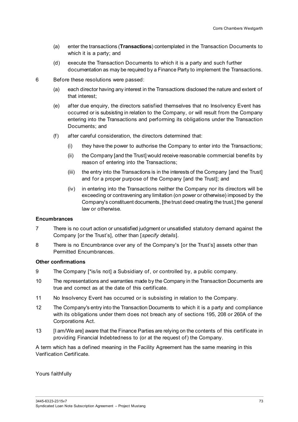 Corrs Chambers Westgarth 3445-6323-2315v7 73 Syndicated Loan Note Subscription Agreement – Project Mustang (a) enter the transactions (Transactions) contemplated in the Transaction Documents to which it is a party; and (d) execute the Transaction Documents to which it is a party and such further documentation as may be required by a Finance Party to implement the Transactions. 6 Before these resolutions were passed: (a) each director having any interest in the Transactions disclosed the nature and extent of that interest; (e) af ter due enquiry, the directors satisf ied themselves that no Insolvency Event has occurred or is subsisting in relation to the Company, or will result f rom the Company entering into the Transactions and performing its obligations under the Transaction Documents; and (f ) af ter careful consideration, the directors determined that: (i) they have the power to authorise the Company to enter into the Transactions; (ii) the Company [and the Trust] would receive reasonable commercial benef its by reason of entering into the Transactions; (iii) the entry into the Transactions is in the interests of the Company [and the Trust] and for a proper purpose of the Company [and the Trust]; and (iv) in entering into the Transactions neither the Company nor its directors will be exceeding or contravening any limitation (on power or otherwise) imposed by the Company's constituent documents, [the trust deed creating the trust,] the general law or otherwise. Encumbrances 7 There is no court action or unsatisfied judgment or unsatisfied statutory demand against the Company [or the Trust’s], other than [specify details]. 8 There is no Encumbrance over any of the Company's [or the Trust’s] assets other than Permitted Encumbrances. Other confirmations 9 The Company [*is/is not] a Subsidiary of , or controlled by, a public company. 10 The representations and warranties made by the Company in the Transaction Documents are true and correct as at the date of this certif icate. 11 No Insolvency Event has occurred or is subsisting in relation to the Company. 12 The Company's entry into the Transaction Documents to which it is a party and compliance with its obligations under them does not breach any of sections 195, 208 or 260A of the Corporations Act. 13 [I am/We are] aware that the Finance Parties are relying on the contents of this certif icate in providing Financial Indebtedness to (or at the request of ) the Company. A term which has a def ined meaning in the Facility Agreement has the same meaning in this Verif ication Certif icate. Yours faithfully