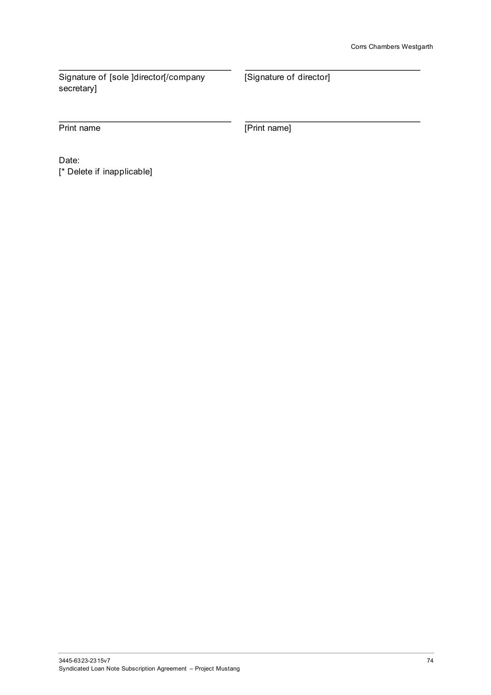 Corrs Chambers Westgarth 3445-6323-2315v7 74 Syndicated Loan Note Subscription Agreement – Project Mustang Signature of [sole ]director[/company secretary] [Signature of director] Print name [Print name] Date: [* Delete if inapplicable]