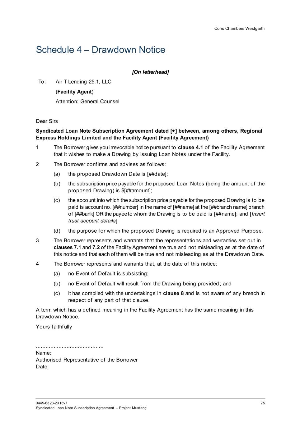 Corrs Chambers Westgarth 3445-6323-2315v7 75 Syndicated Loan Note Subscription Agreement – Project Mustang Schedule 4 – Drawdown Notice [On letterhead] To: Air T Lending 25.1, LLC (Facility Agent) Attention: General Counsel Dear Sirs Syndicated Loan Note Subscription Agreement dated [] between, among others, Regional Express Holdings Limited and the Facility Agent (Facility Agreement) 1 The Borrower gives you irrevocable notice pursuant to clause 4.1 of the Facility Agreement that it wishes to make a Drawing by issuing Loan Notes under the Facility. 2 The Borrower conf irms and advises as follows: (a) the proposed Drawdown Date is [##date]; (b) the subscription price payable for the proposed Loan Notes (being the amount of the proposed Drawing) is $[##amount]; (c) the account into which the subscription price payable for the proposed Drawing is to be paid is account no. [##number] in the name of [##name] at the [##branch name] branch of [##bank] OR the payee to whom the Drawing is to be paid is [##name]; and [Insert trust account details] (d) the purpose for which the proposed Drawing is required is an Approved Purpose. 3 The Borrower represents and warrants that the representations and warranties set out in clauses 7.1 and 7.2 of the Facility Agreement are true and not misleading as at the date of this notice and that each of them will be true and not misleading as at the Drawdown Date. 4 The Borrower represents and warrants that, at the date of this notice: (a) no Event of Default is subsisting; (b) no Event of Default will result f rom the Drawing being provided ; and (c) it has complied with the undertakings in clause 8 and is not aware of any breach in respect of any part of that clause. A term which has a def ined meaning in the Facility Agreement has the same meaning in this Drawdown Notice. Yours faithfully .......................................... Name: Authorised Representative of the Borrower Date: