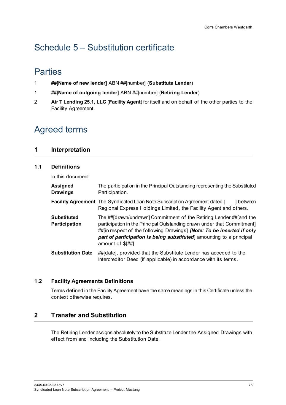 Corrs Chambers Westgarth 3445-6323-2315v7 76 Syndicated Loan Note Subscription Agreement – Project Mustang Schedule 5 – Substitution certificate Parties 1 ##[Name of new lender] ABN ##[number] (Substitute Lender) 1 ##[Name of outgoing lender] ABN ##[number] (Retiring Lender) 2 Air T Lending 25.1, LLC (Facility Agent) for itself and on behalf of the other parties to the Facility Agreement. Agreed terms 1 Interpretation 1.1 Definitions In this document: Assigned Drawings The participation in the Principal Outstanding representing the Substituted Participation. Facility Agreement The Syndicated Loan Note Subscription Agreement dated [ ] between Regional Express Holdings Limited, the Facility Agent and others. Substituted Participation The ##[drawn/undrawn] Commitment of the Retiring Lender ##[and the participation in the Principal Outstanding drawn under that Commitment] ##[in respect of the following Drawings] [Note: To be inserted if only part of participation is being substituted] amounting to a principal amount of $[##]. Substitution Date ##[date], provided that the Substitute Lender has acceded to the Intercreditor Deed (if applicable) in accordance with its terms. 1.2 Facility Agreements Definitions Terms def ined in the Facility Agreement have the same meanings in this Certificate unless the context otherwise requires. 2 Transfer and Substitution The Retiring Lender assigns absolutely to the Substitute Lender the Assigned Drawings with ef fect f rom and including the Substitution Date.