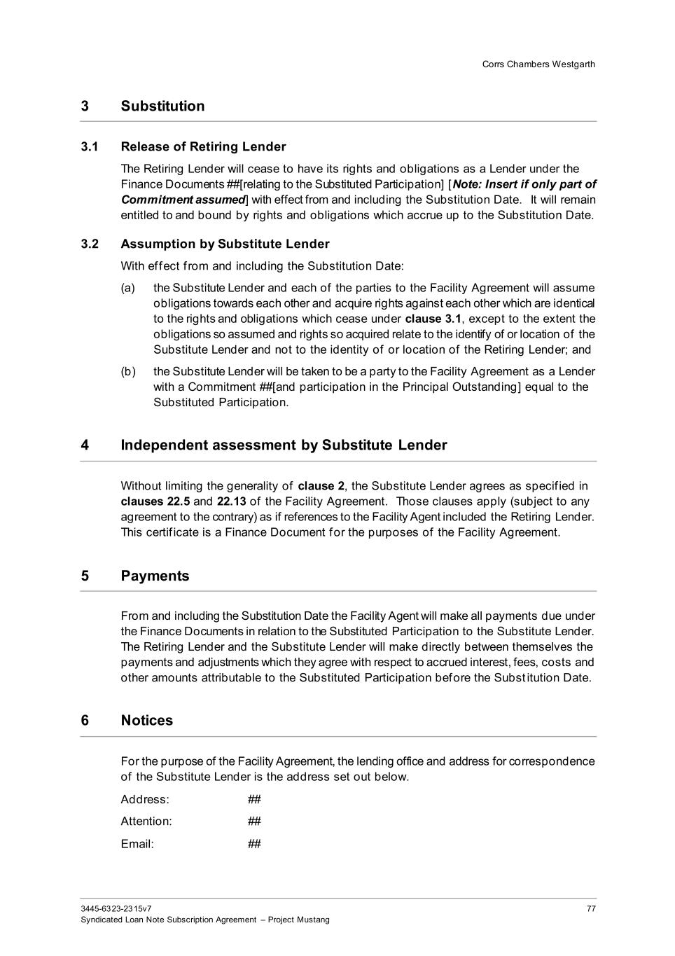 Corrs Chambers Westgarth 3445-6323-2315v7 77 Syndicated Loan Note Subscription Agreement – Project Mustang 3 Substitution 3.1 Release of Retiring Lender The Retiring Lender will cease to have its rights and obligations as a Lender under the Finance Documents ##[relating to the Substituted Participation] [Note: Insert if only part of Commitment assumed] with effect from and including the Substitution Date. It will remain entitled to and bound by rights and obligations which accrue up to the Substitution Date. 3.2 Assumption by Substitute Lender With ef fect f rom and including the Substitution Date: (a) the Substitute Lender and each of the parties to the Facility Agreement will assume obligations towards each other and acquire rights against each other which are identical to the rights and obligations which cease under clause 3.1, except to the extent the obligations so assumed and rights so acquired relate to the identify of or location of the Substitute Lender and not to the identity of or location of the Retiring Lender; and (b) the Substitute Lender will be taken to be a party to the Facility Agreement as a Lender with a Commitment ##[and participation in the Principal Outstanding] equal to the Substituted Participation. 4 Independent assessment by Substitute Lender Without limiting the generality of clause 2, the Substitute Lender agrees as specif ied in clauses 22.5 and 22.13 of the Facility Agreement. Those clauses apply (subject to any agreement to the contrary) as if references to the Facility Agent included the Retiring Lender. This certif icate is a Finance Document for the purposes of the Facility Agreement. 5 Payments From and including the Substitution Date the Facility Agent will make all payments due under the Finance Documents in relation to the Substituted Participation to the Substitute Lender. The Retiring Lender and the Substitute Lender will make directly between themselves the payments and adjustments which they agree with respect to accrued interest, fees, costs and other amounts attributable to the Substituted Participation before the Subst itution Date. 6 Notices For the purpose of the Facility Agreement, the lending office and address for correspondence of the Substitute Lender is the address set out below. Address: ## Attention: ## Email: ##