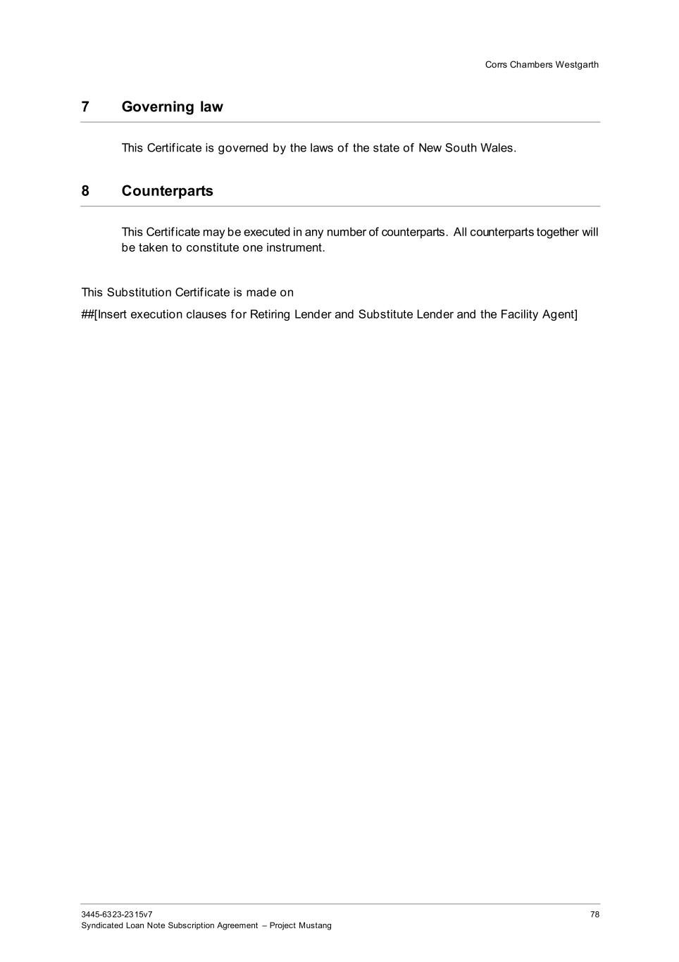 Corrs Chambers Westgarth 3445-6323-2315v7 78 Syndicated Loan Note Subscription Agreement – Project Mustang 7 Governing law This Certif icate is governed by the laws of the state of New South Wales. 8 Counterparts This Certif icate may be executed in any number of counterparts. All counterparts together will be taken to constitute one instrument. This Substitution Certif icate is made on ##[Insert execution clauses for Retiring Lender and Substitute Lender and the Facility Agent]