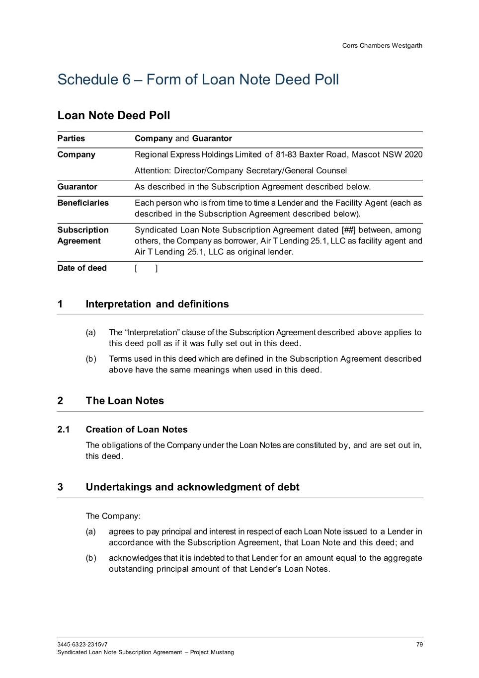 Corrs Chambers Westgarth 3445-6323-2315v7 79 Syndicated Loan Note Subscription Agreement – Project Mustang Schedule 6 – Form of Loan Note Deed Poll Loan Note Deed Poll Parties Company and Guarantor Company Regional Express Holdings Limited of 81-83 Baxter Road, Mascot NSW 2020 Attention: Director/Company Secretary/General Counsel Guarantor As described in the Subscription Agreement described below. Beneficiaries Each person who is from time to time a Lender and the Facility Agent (each as described in the Subscription Agreement described below). Subscription Agreement Syndicated Loan Note Subscription Agreement dated [##] between, among others, the Company as borrower, Air T Lending 25.1, LLC as facility agent and Air T Lending 25.1, LLC as original lender. Date of deed [ ] 1 Interpretation and definitions (a) The “Interpretation” clause of the Subscription Agreement described above applies to this deed poll as if it was fully set out in this deed. (b) Terms used in this deed which are def ined in the Subscription Agreement described above have the same meanings when used in this deed. 2 The Loan Notes 2.1 Creation of Loan Notes The obligations of the Company under the Loan Notes are constituted by, and are set out in, this deed. 3 Undertakings and acknowledgment of debt The Company: (a) agrees to pay principal and interest in respect of each Loan Note issued to a Lender in accordance with the Subscription Agreement, that Loan Note and this deed; and (b) acknowledges that it is indebted to that Lender for an amount equal to the aggregate outstanding principal amount of that Lender’s Loan Notes.
